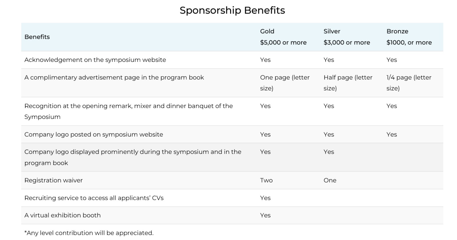 公司的支持对于会议和ICSA的成功一直都是至关重要的。您的企业赞助不仅将显示您在行业中的领导地位,还将显示公司对统计学家在业务中的重大贡献的认可。我们欢迎公司为会议提供任意的赞助。具体来说,我们将在开幕词、晚宴及其他形式上提及金牌(30000元)、银牌(20000元)和铜牌(6000元)赞助商。您的公司徽标将出现在会议网站赞助商部分,公司的免费广告页面也将包含在会议手册中。金牌和银牌赞助商将免费注册,同时会议将为金牌赞助商提供展位和招聘服务。更多赞助商福利详情,请访问