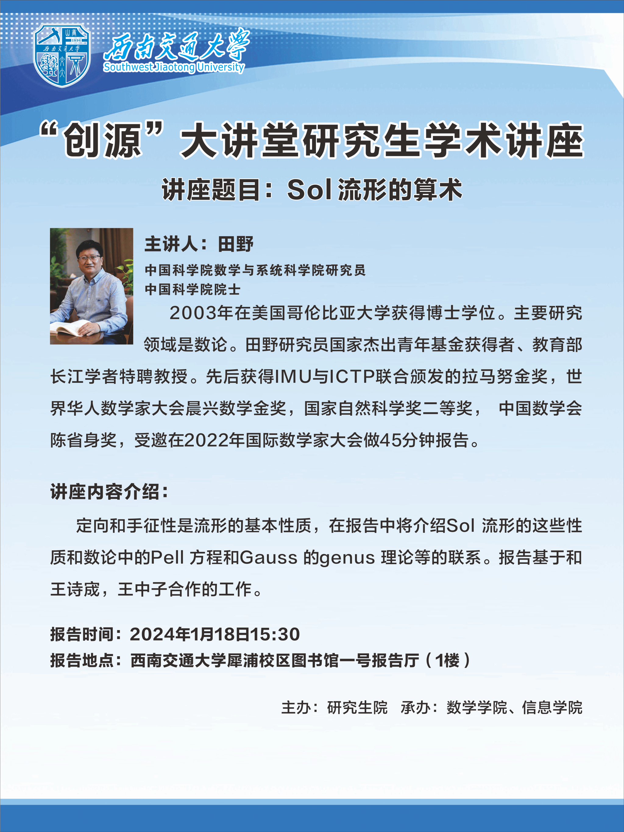 报告简介:定向和手征性是流形的基本性质,在报告中将介绍Sol 流形的这些性质和数论中的Pell 方程和Gauss 的genus 理论等的联系。报告基于和王诗宬,王中子合作的工作。