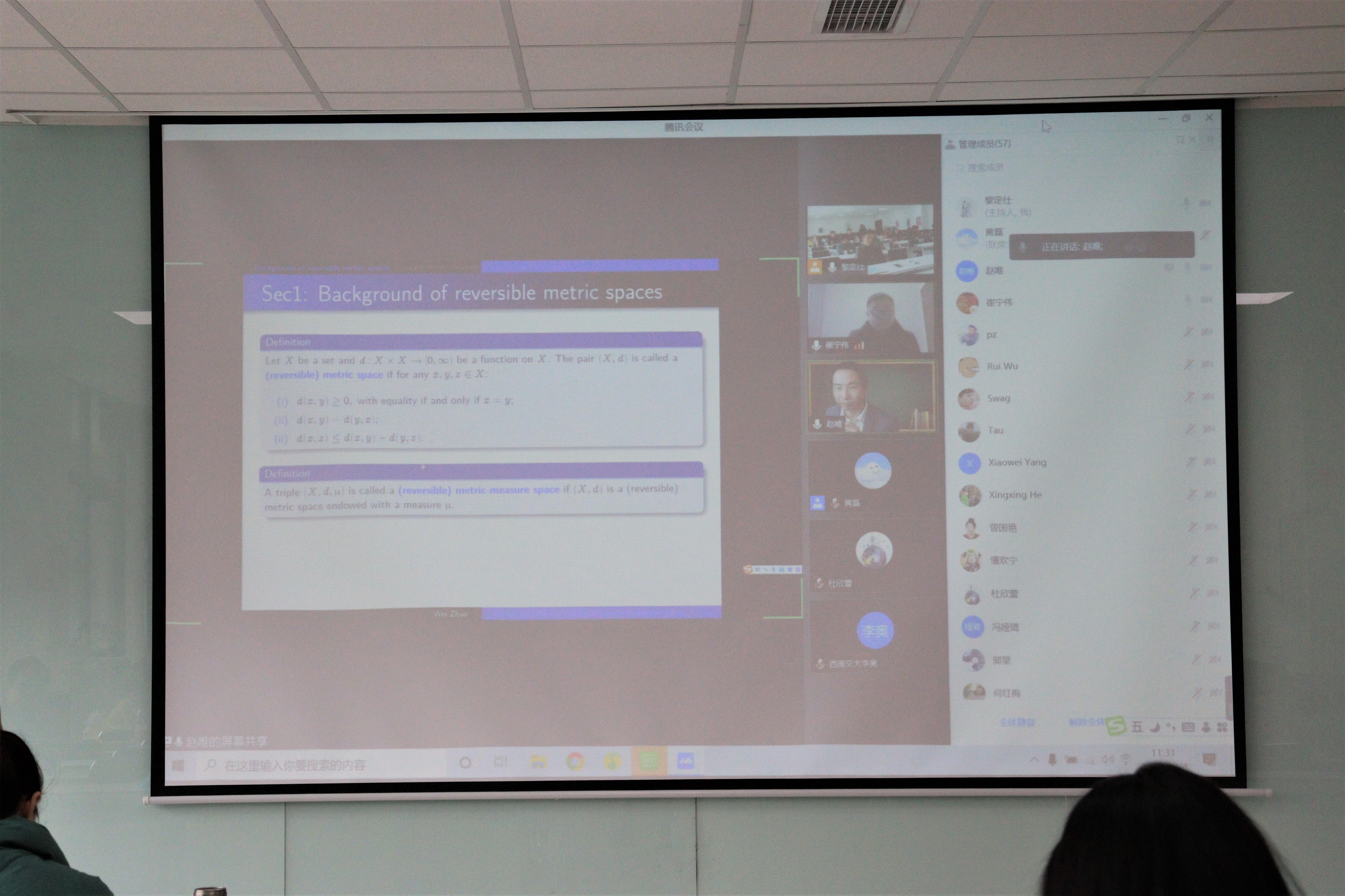 11时30分,来自华东理工大学的赵唯教授以“关于不可逆度量空间的几何”为题,介绍了最近与A. Kristaly的联合关注研究Gromov-Huasdorff收敛性和不可逆度量空间的稳定性,这两者都是在紧凑和非紧凑的情况下。而紧凑的设置主要是类似的可逆情况下由J. Lott,K,-T. Sturm和C. Villani 共同开发的,非紧凑的情况下提供了各种令人惊讶的现象。由于非紧的不可逆空间的可逆性可能是无限的,它的动机是引入一个合适的非减函数,边界的可逆性越来越大的球。通过这种方法,我们能够证明满意的收敛性/稳定性结果在一个合适的--可逆性依赖--Gromov-Huasdorff拓扑。Finsler流形提供了广泛的一类不可逆空间,它通过指出可逆和不可逆设置之间的真正差异来构造各种模型示例。