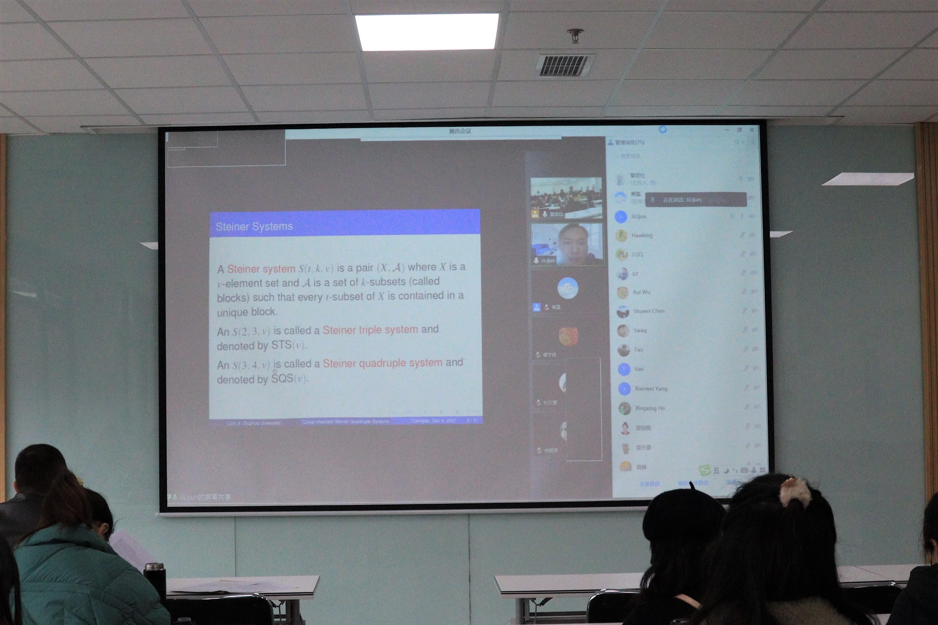 上午10时,来自苏州大学的季利均教授以“阿贝尔群不变Steiner四元系”为题,对阿贝尔群和Steiner四元系展开了详细的论述。现在K是一个阶为v的阿贝尔群。如果对于每个在\B中B,成立:每一个B+x在\B(对任意K中的x成立)中和B=-B+y(对某些在K中的y成立),那么一个阶为v的Steiner四元系统(SQS(v))(K,\B)被称为对称的K不变量。在这次演讲中,季教授提出,当且仅当v同余于2,4(mod6),K的每个元素的顺序不被8整除,并且对于v的任何奇数素数p存在一个对称的K不变的SQS(2p)。