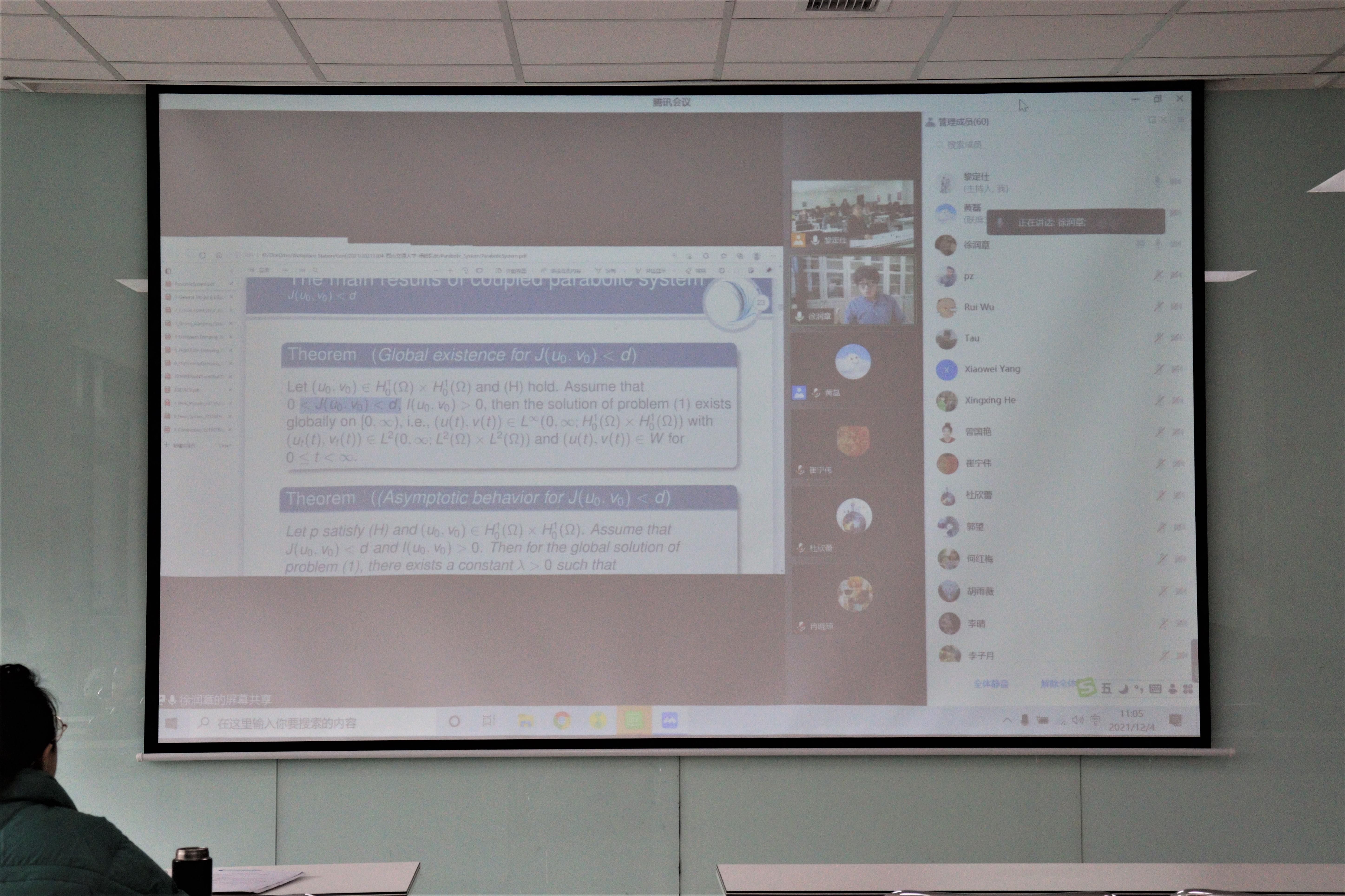 上午10时50分,来自哈尔滨工程大学的徐润章教授以“耦合抛物型方程组的整体适定性”为题,s考虑一类具有非线性耦合源项的反应扩散方程组(耦合抛物方程组)的边值问题,对全解的全局存在性、有限时间爆破性和长时间衰减性等初始数据进行分类。整个研究按照初始能量考虑三种情况:低初始能量情况、临界初始能量情形和高初始能量的情况。对低初始能量和临界初始能量情形,给出了全局存在、长时间衰减和有限时间爆破的充分初始条件,得到了一个尖锐的条件。首先证明了在高初始能量的情况下,系统存在有限时间爆破和全局爆破的可能性,然后分别得到了有限时刻爆破和整体爆破的若干充分初始条件。