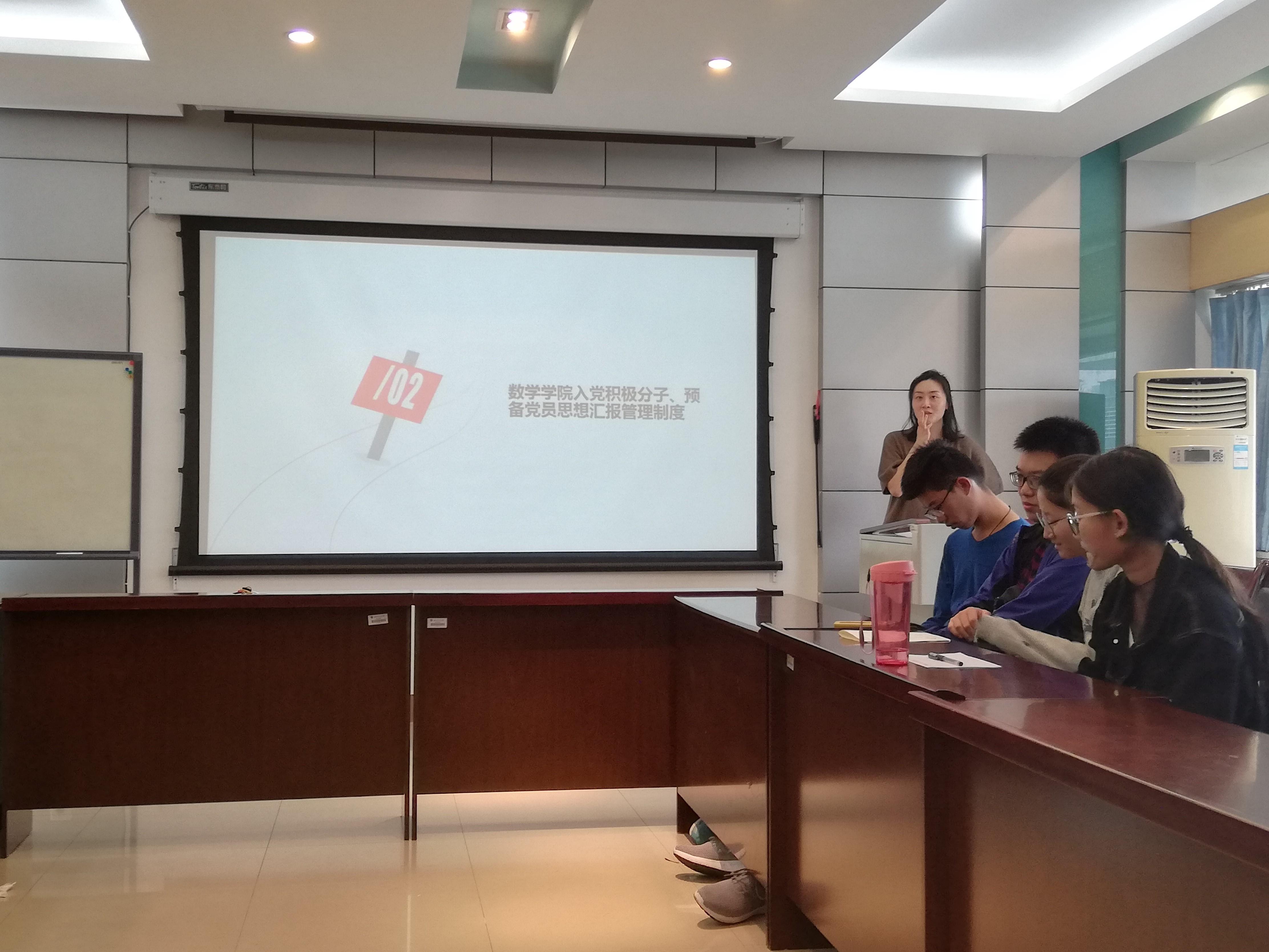 十月十二日下午一点vwin德赢ac米兰官网在X2511召开支部会议暨积极分子培训大会,该会议由vwin德赢ac米兰官网学工办主任兼学生党建指导老师卢怡帆老师主持,出席本次会议的有应数专业党支部书记孙昊,统计专业党支部书记张雁灵以及各班团支书和入党积极分子人员。