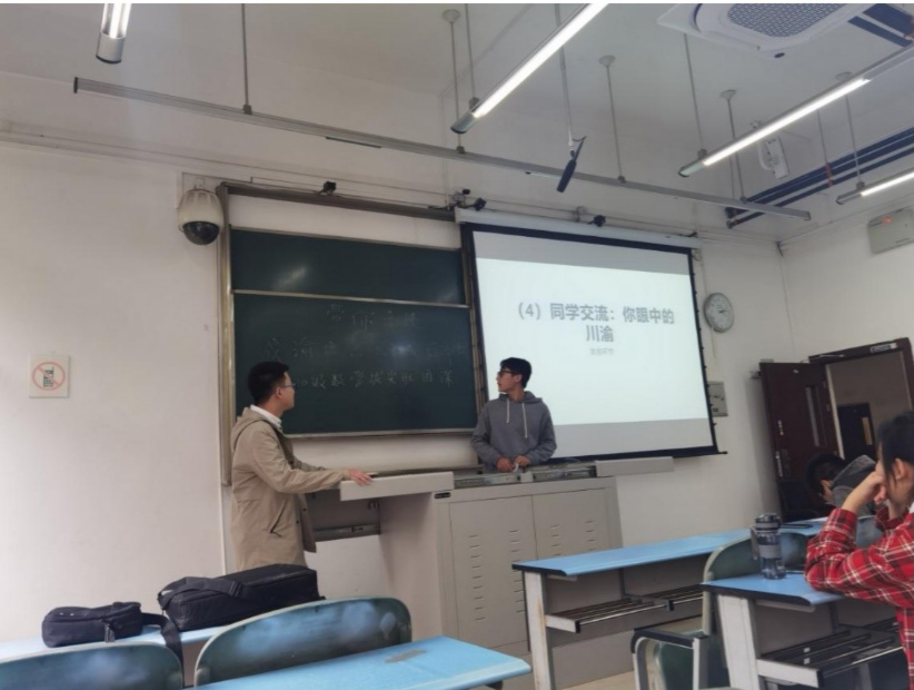 团课开始,首先由刘蘅丰带领同学们齐唱团歌。接着,他用提问的方式引入“经济圈”的概念,激发了同学们的兴趣。随后,刘蘅丰组织大家观看视频,让同学们从数据,图片的角度更深入地理解了成渝双城经济圈的发展现状。然后,他分别从大学,交通等多个角度与同学们畅谈成渝发展,并邀请川渝同学代表上台交流。