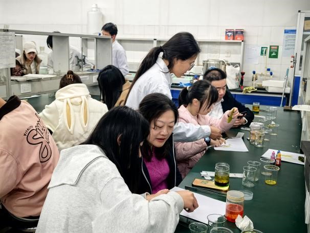 活动现场,化学学院本科党支部成员化身“实验小导师”,组织了两个趣味十足的小实验。在“熔岩灯”实验环节,随着试剂的缓缓注入,五彩斑斓的如梦幻熔岩般翻滚涌动,惊叹于化学物质间奇妙反应所营造出的奇幻景象过程中,带领党员同志们学习到密度、反应速率等化学原理的直观呈现。“叶脉书签”制作环节,党员们小心翼翼地去除叶片表皮,留下精美叶脉,体验化学试剂与自然材料的完美碰撞。
