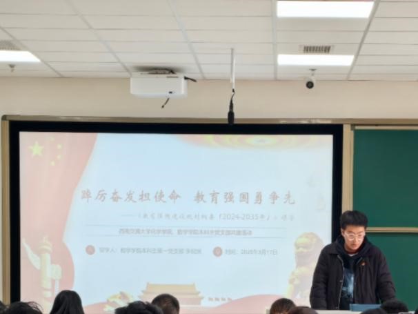 “学思想”是本科生党支部主题教育、理论学习的首要任务和第一主线,为扎实做好新时代创新理论的深化、内化、转化工作,化学学院本科第一党支部的满昊天同志和vwin德赢ac米兰官网本科生第一党支部的李倪洲同志领学3月主题教育。满昊天同志带领与会人员详细解读了《教育强国建设规划纲要(2024—2035年)》(以下称《纲要》),将《纲要》比作行军图,表明了深耕专业领域、担当青年使命的决心;李倪洲同志以“踔厉奋发担使命·教育强国勇争先”为主题,从时代背景、纲要内涵、党员担当三个维度展开,勉励党员同志要从思想上破除三大误区、能力上提升自身硬实力和软实力、以及行动上做到三个穿透,为2035年的中国教育贡献自己的一份力量!
