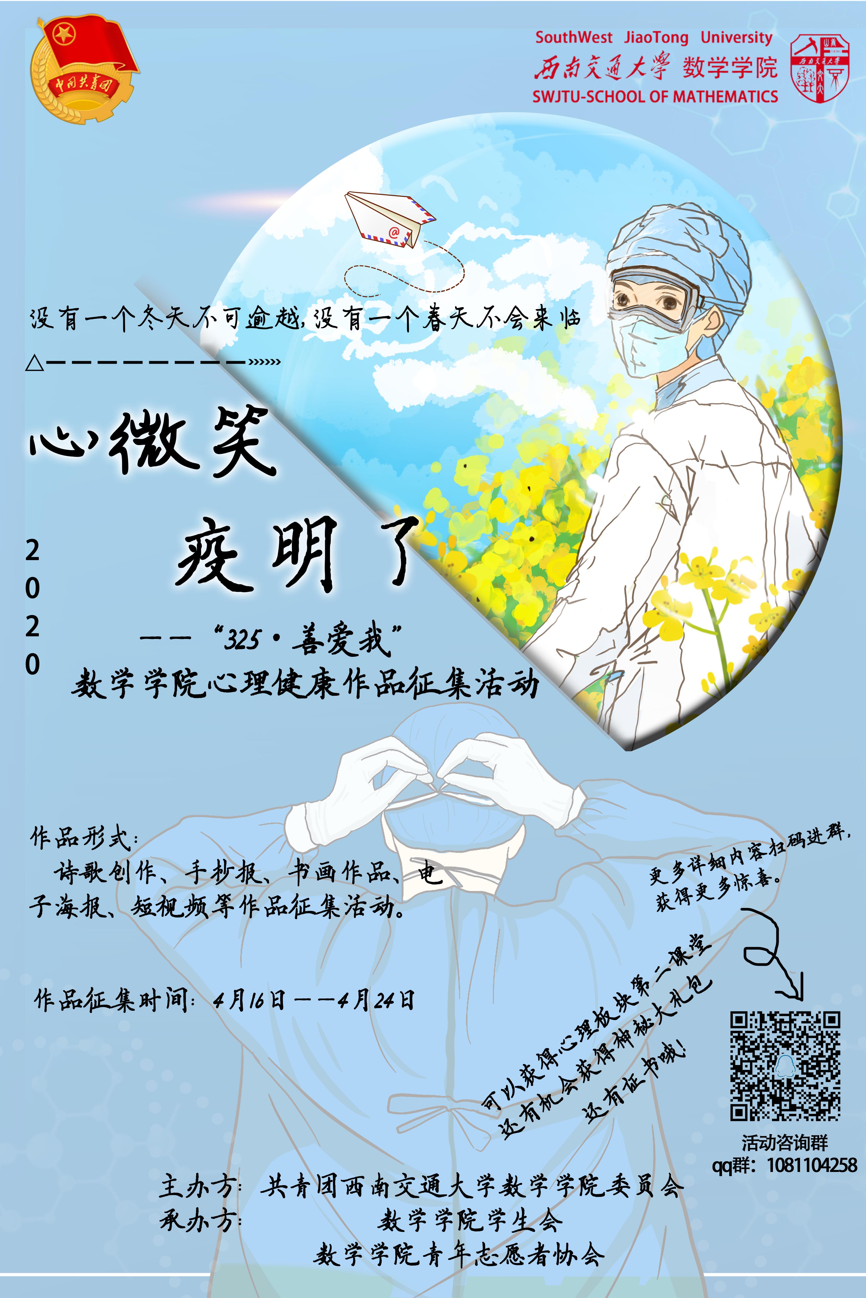 在这个特别的春天,由于新冠疫情的影响,我们无法在交大校园如约相见,只能通过网络进行学习和联络。即便如此,我们依然要保持积极乐观的心态,要相信没有一个冬天不可逾越,没有一个春天不会来临。为了响应学校在疫情期间开展心理健康活动的工作要求,帮助大学生正视心理问题,加强疫情心理、生命和感恩教育,引导大学生善待自我、关爱自我,珍视健康、敬畏生命,营造积极向上的校园心理文化。由vwin德赢ac米兰官网团委主,院学生会、青协联合承办“心微笑,‘疫’明了”——vwin德赢ac米兰官网心理健康作品征集活动,在此号召全院学子积极踊跃的参赛,优秀作品将获得院级证书和精美奖品。