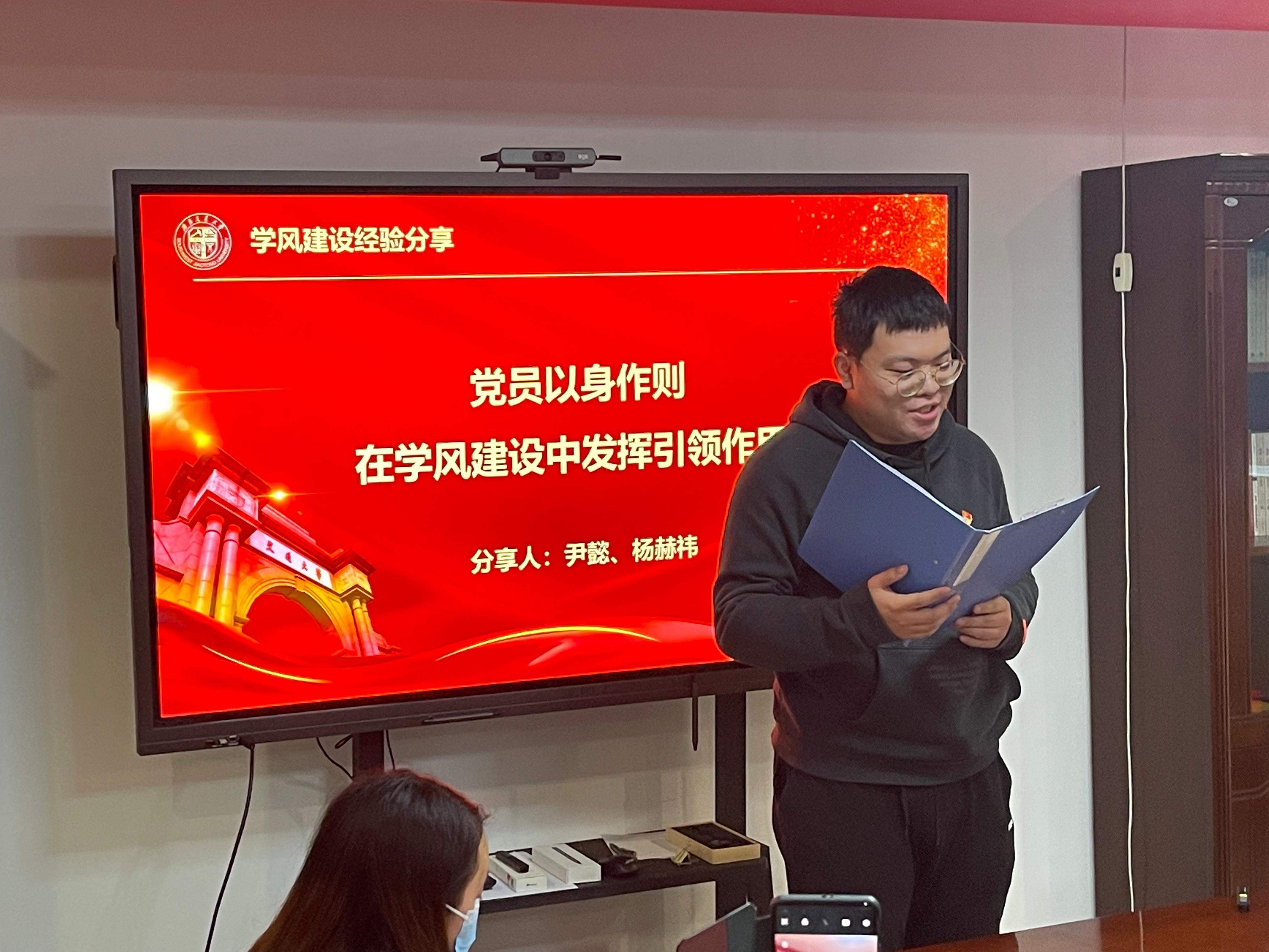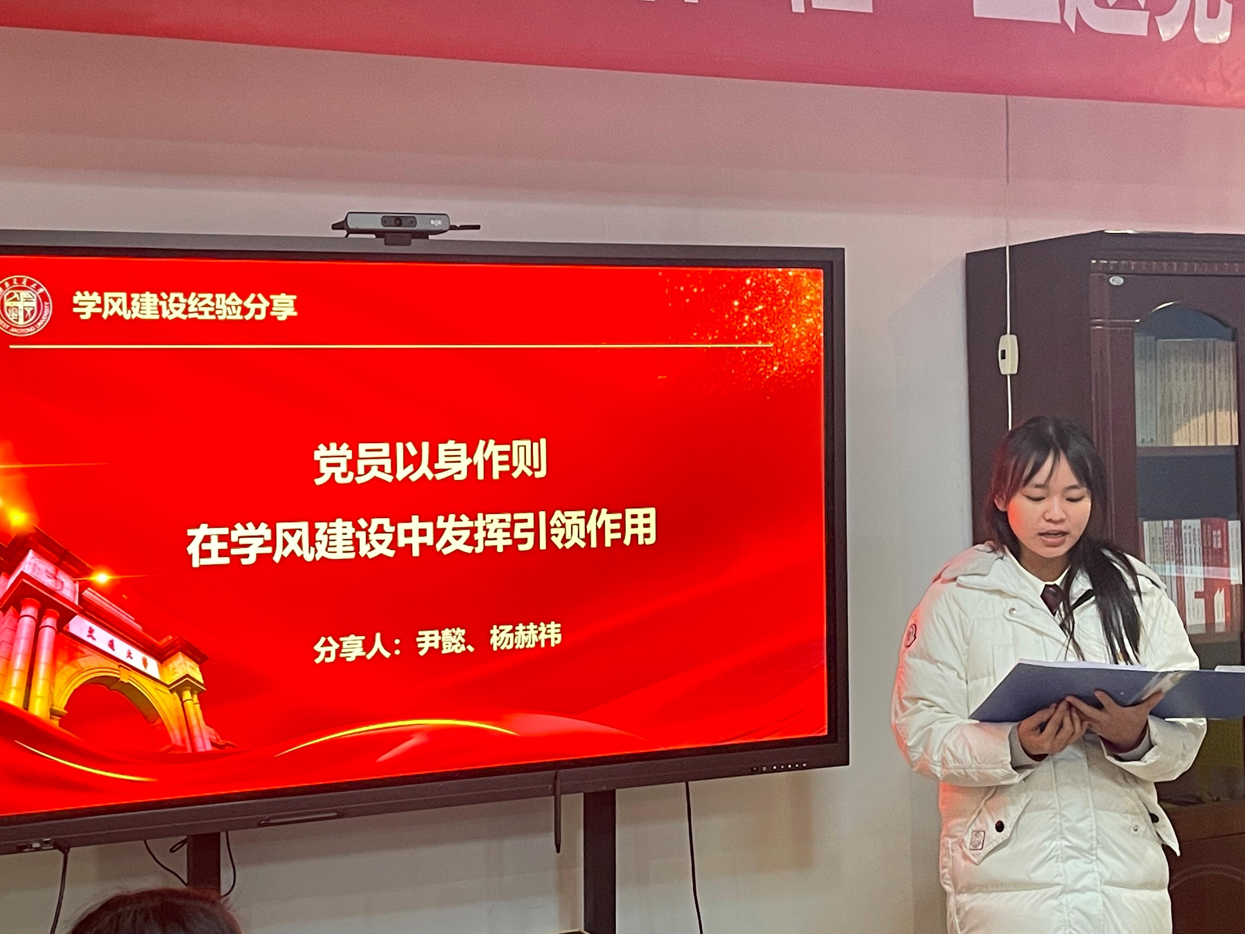 2名本科生党员代表分享学风建设经验。尹懿提到“要发挥党员先锋模范作用,重视发挥党支部在学院学风建设中发挥的引领作用”;杨赫祎则主要谈及自己的科创经历,以身作则,主动担当,发挥党员作用为低年级同学举办专业介绍会等经验。