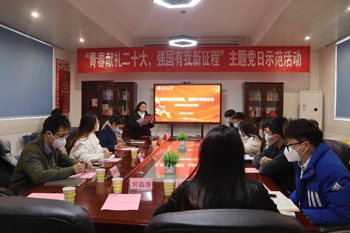 为深入学习贯彻习近平新时代中国特色社会主义思想和党的二十大精神,引导青年党员高举中国特色社会主义伟大旗帜,立足新时代新征程,坚定不移听党话、跟党走,12月9日下午,vwin德赢ac米兰官网开展“踔厉奋发扬新貌,数耀中华向未来”主题党日活动。vwin德赢ac米兰官网党委书记徐革、vwin德赢ac米兰官网团委书记邓思然、vwin德赢ac米兰官网党委专职组织员徐海晶、vwin德赢ac米兰官网学生工作组、22级研究生党支部、本科生党支部参与本次活动,22级研究生党支部书记郭悦主持本次活动。
