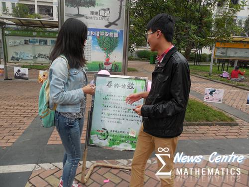 2015年4月23日,17点整。于vwin德赢一、二食堂门口,由vwin德赢ac米兰官网校团委举办,vwin德赢ac米兰官网新闻中心承办的“春韵·情数”春日摄影比赛和数学三行情诗最终投票环节正式拉开帷幕。