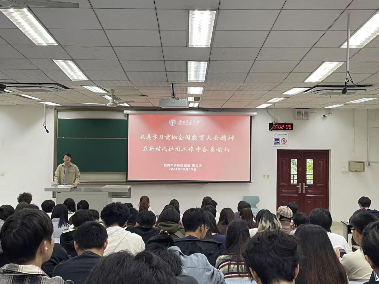 为深入学习贯彻全国教育大会精神,深化学生社团改革,充分发挥学生社团育人功能,用青年话语讲好社团思政课,10月19日晚,《认真学习贯彻全国教育大会精神,在新时代社团工作中奋勇前行》主题宣讲会在犀浦校区举行,近百名社团干部参加宣讲。