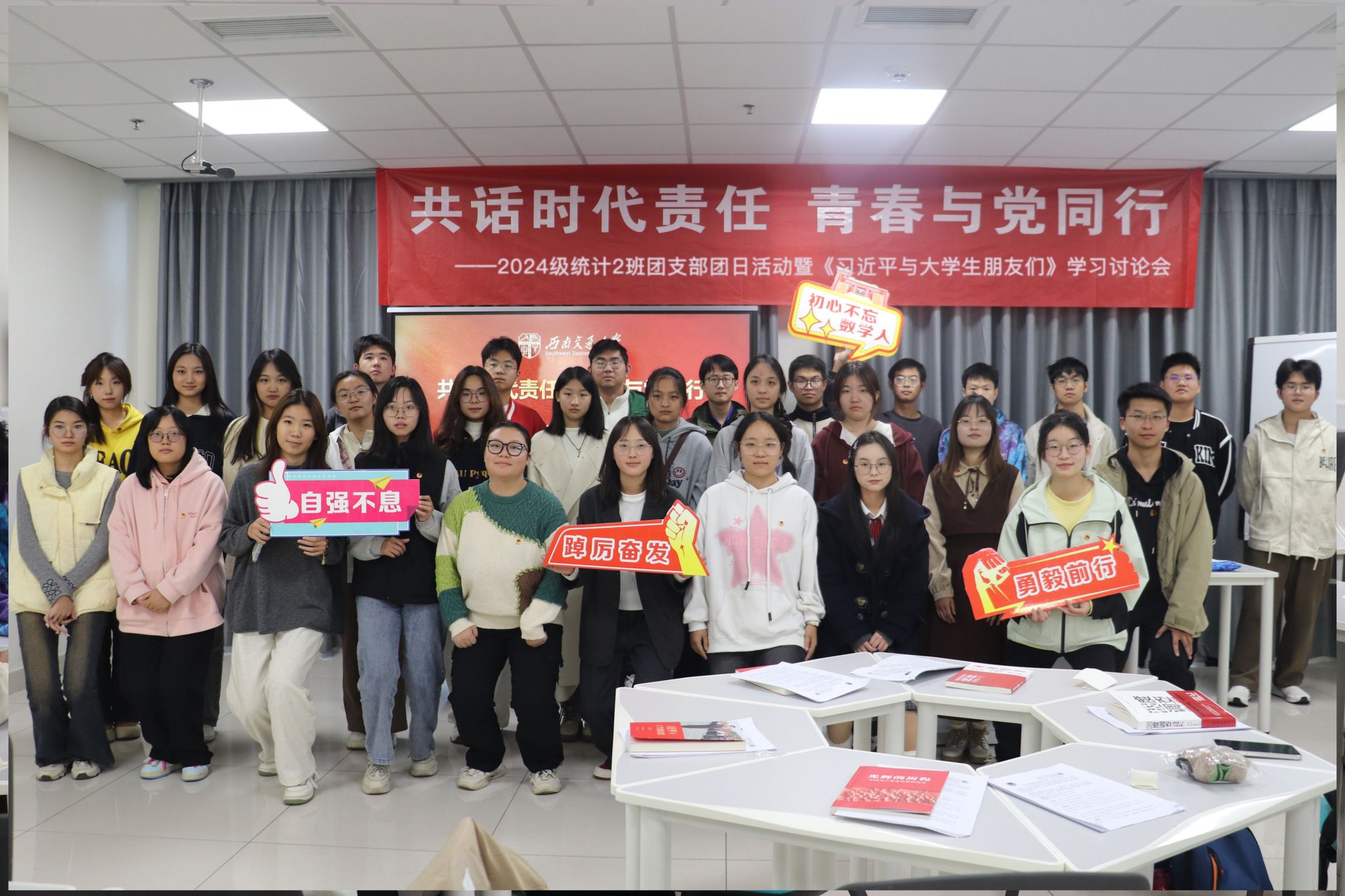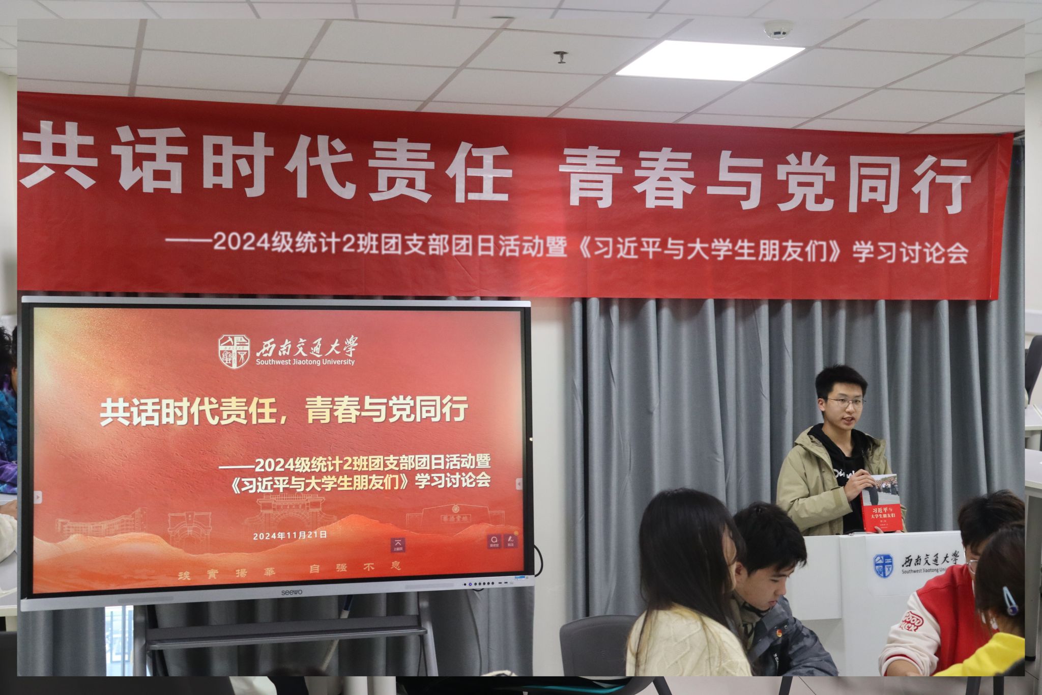 为深入学习贯彻习近平新时代中国特色社会主义思想,2024年11月21日,vwin德赢ac米兰官网2024级统计2班团支部“共话时代责任,青春与党同行”主题团日活动暨《习近平与大学生朋友们》学习讨论会在X30384顺利举办。本次活动由团建中心詹延同学主持,30余名师生参加。