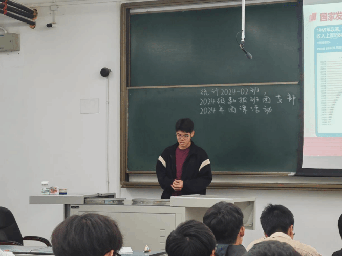 2024年11月8日下午,应用数学专业2024级拔尖班和统计学专业2024级2班团支部于X7309开展了以“庆祝中华人民共和国成立75周年”为主题的团课活动,同时邀请了vwin德赢ac米兰官网团委副书记赵彦通开展了“两弹一星”主题讲座。