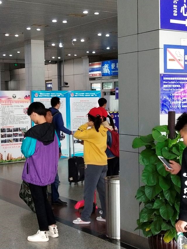第一组打扫卫生的同学工作量最大,但大家都很认真。有些同学拿着扫帚在清扫候车大厅里的垃圾,尽管很累,但仍然坚持着打扫完了客运站里所有的垃圾:有些同学带着手套,拿着抹布,擦拭着候车大厅里的花盆,栏杆,使得原本灰扑扑的大厅变得光亮可鉴。整个客运站随处可见的戴着小红帽、正在打扫卫生的志愿者们形成了一道亮丽的风景线。