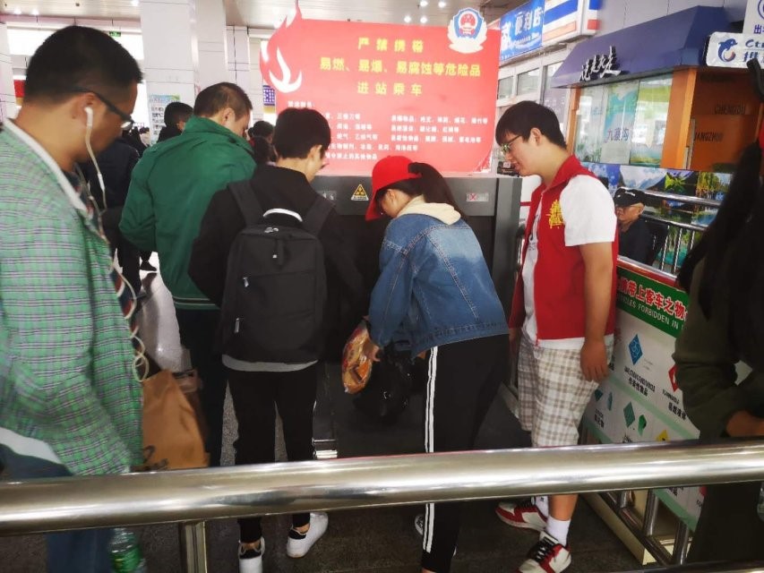 第二组帮助乘客过安检的同学,他们的工作乏味重复,但他们仍然一丝不苟的坚持了下来。客运站里来来往往的乘客大都携带着行李箱或是大大小小的包裹,过安检很不方便。志愿者们就帮助旅客们把行李搬上安检的机器,使他们更快更方便的过安检。