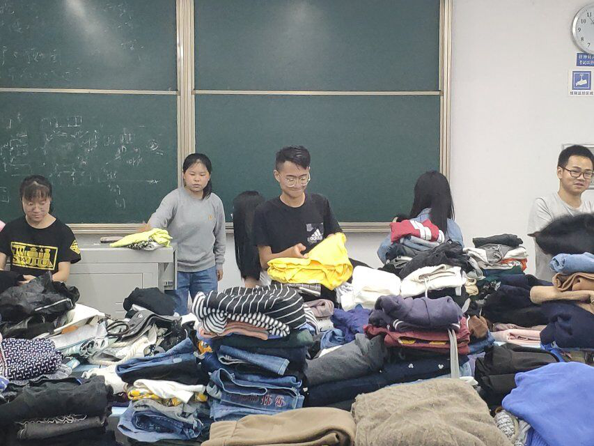 5月27日晚7时,到了旧衣整理的时候。志愿者们租来三轮车把放在寝室的旧衣运到x2426教室,在教室里整理衣服,分门别类地将衣服整理好。忙忙碌碌了两个小时才将衣服整理好,再放进提前准备好的收纳袋里,运到2503教室放好,等待捐赠。也有部分衣服存在过于损坏、破旧、发霉等问题,志愿者将这些衣服单独放进袋子里,整理完毕后扔到指定地点。