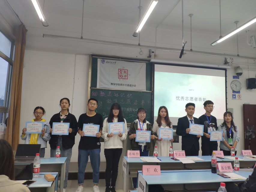 大会第五项,优秀志愿者表彰。数学青协的会长张红佳给优秀志愿者梁言、齐璐娜、肖思诚、蒋名琪、雒斯亮、刘佳晖、满晶晶、吴雅祺等颁发荣誉证书,同时希望他们坚守志愿者初衷,无私奉献,志愿公益。