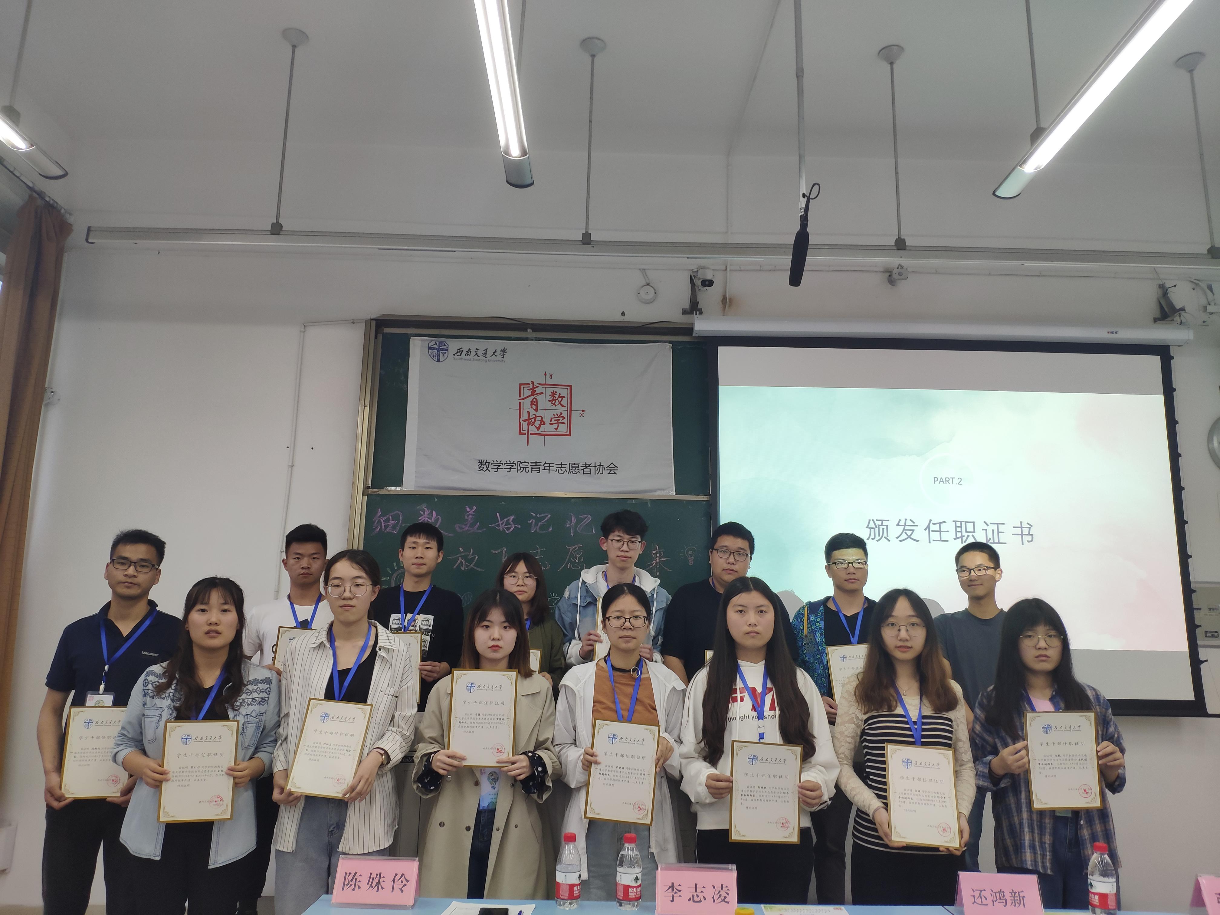 大会第二项,颁发任职证书。vwin德赢ac米兰官网团委副书记还鸿新为努力工作的会长、部长颁发任职聘书,并鼓励他们在接下来的工作中再接再厉,带领数学青协获得十佳青协的荣誉!