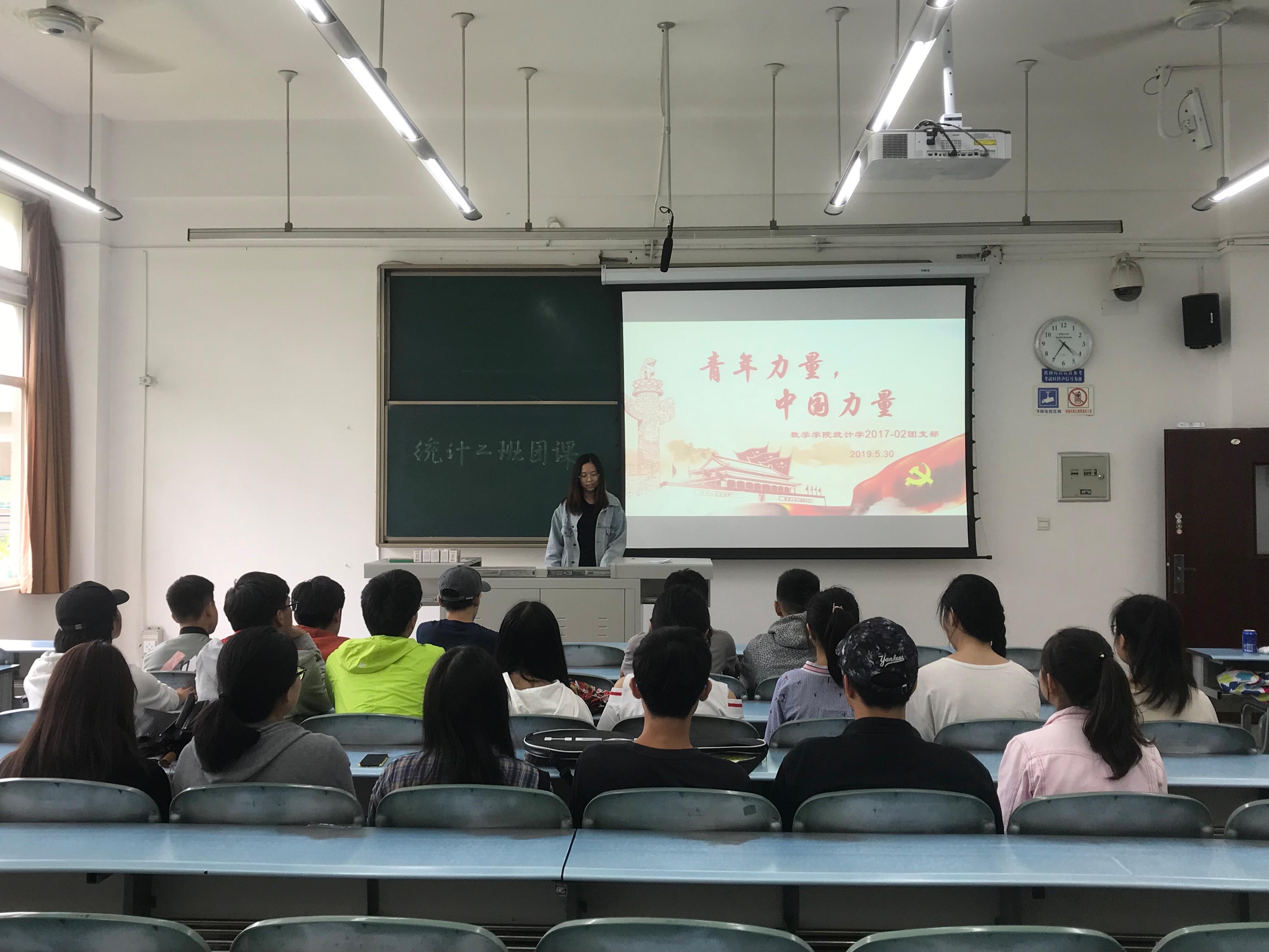 为了深入了解贯彻习近平新时代中国特色社会主义思想和党的十九大精神、习近平总书记“7·2”重要讲话精神,纪念“五四运动”100周年,5月30日下午4点30分,vwin德赢ac米兰官网统计学2017-02团支部组织开展了“青年力量,中国力量”主题团日活动。本次团课由团支书俞子歆主持。