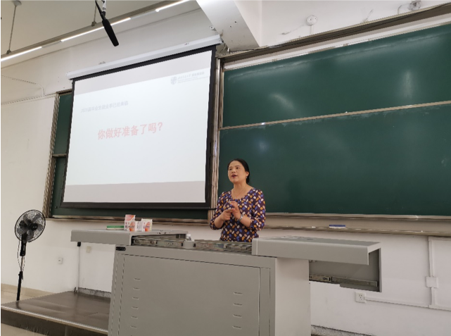 会议第二项,招生就业处黄春蓉副处长为同学们讲解就业形势。黄处长首先向同学们展示了两个问题——“面对毕业就业季,你是否已经做好准备?”“面临就业,你处于哪种状态?”,引起了同学们面对问题就业问题的思考。她提到,当前就业环境的结构性矛盾突出,高校、学历、学科、性别、地域甚至单位之间都存在着不平衡,但是由于经济的增长与国家促进普通高等学校毕业生的就业政策,当前大学生就业机会较多,提醒学生应当明晰多种就业渠道,了解就业,把握机会,做好就业准备。