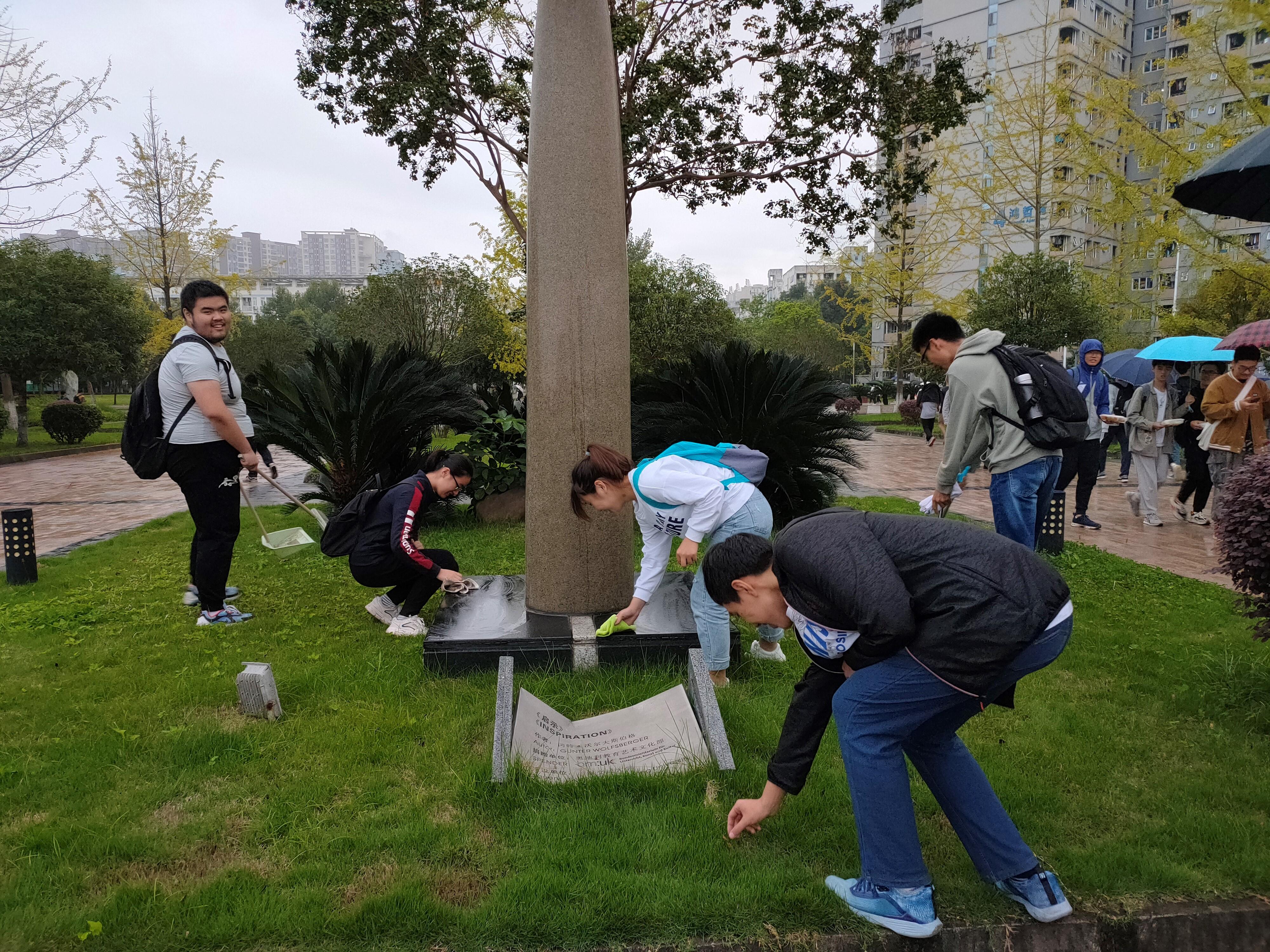 分组二的同学先清理掉了雕塑上的花瓣,再用抹布擦拭了雕像,同时也清扫了周围的落叶。