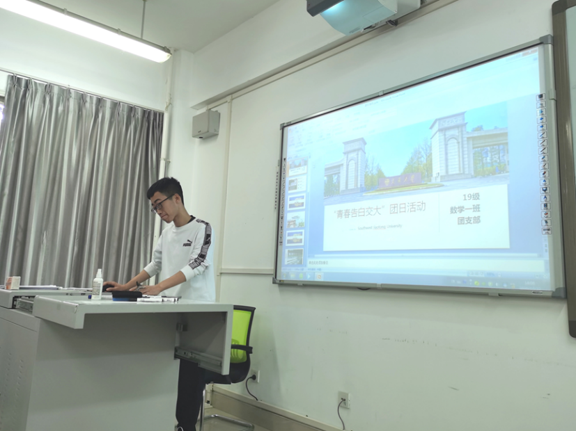 为全面贯彻习近平新时代中国特色社会主义思想,响应学院号召,应用数学2019级1班团支部全体成员在团支书史晓瑜的带领下,于2020年10月22日下午两点开展了以“青春告白交大”为主题的秋季团日活动。本次团日活动以分享、讨论的方式在教室开展,支部29位团员全部参加。vwin德赢ac米兰官网团委实践部副部长懂欢宁、科创部副部长何未参与活动。