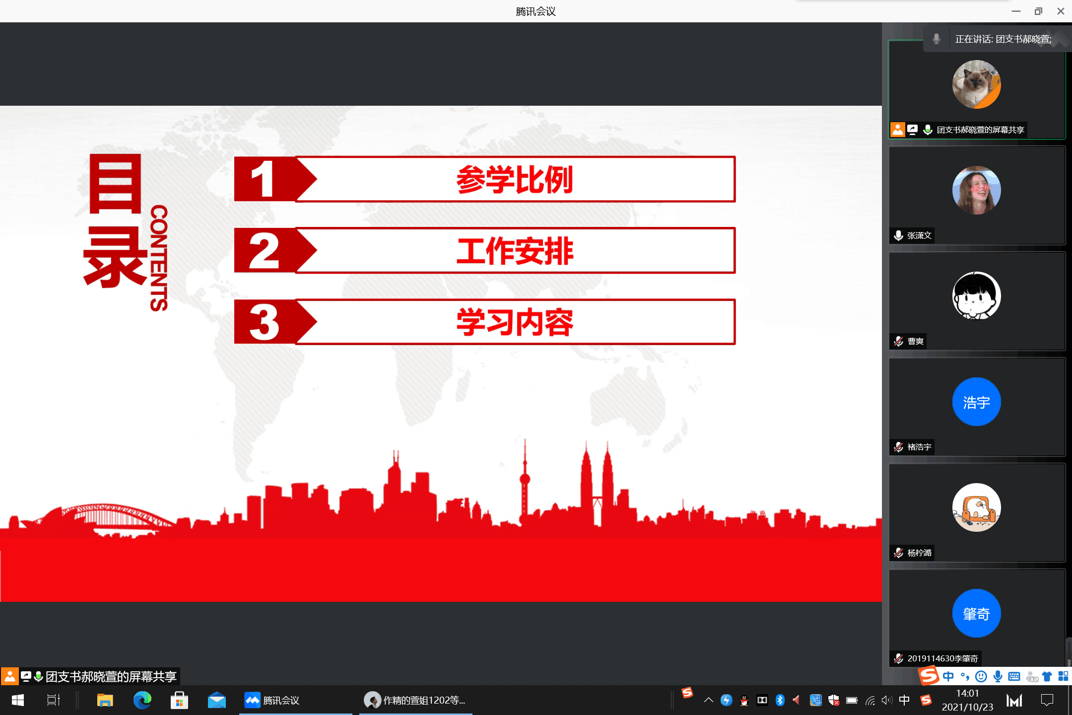团支书郝晓萱从以往参学比例,日后工作安排和本学年学习内容这三个方面向各位团员强调了青年大学习的重要性,大家也在会议上达成一致,认真学党史,学思想,做社会主义新时代的好青年。