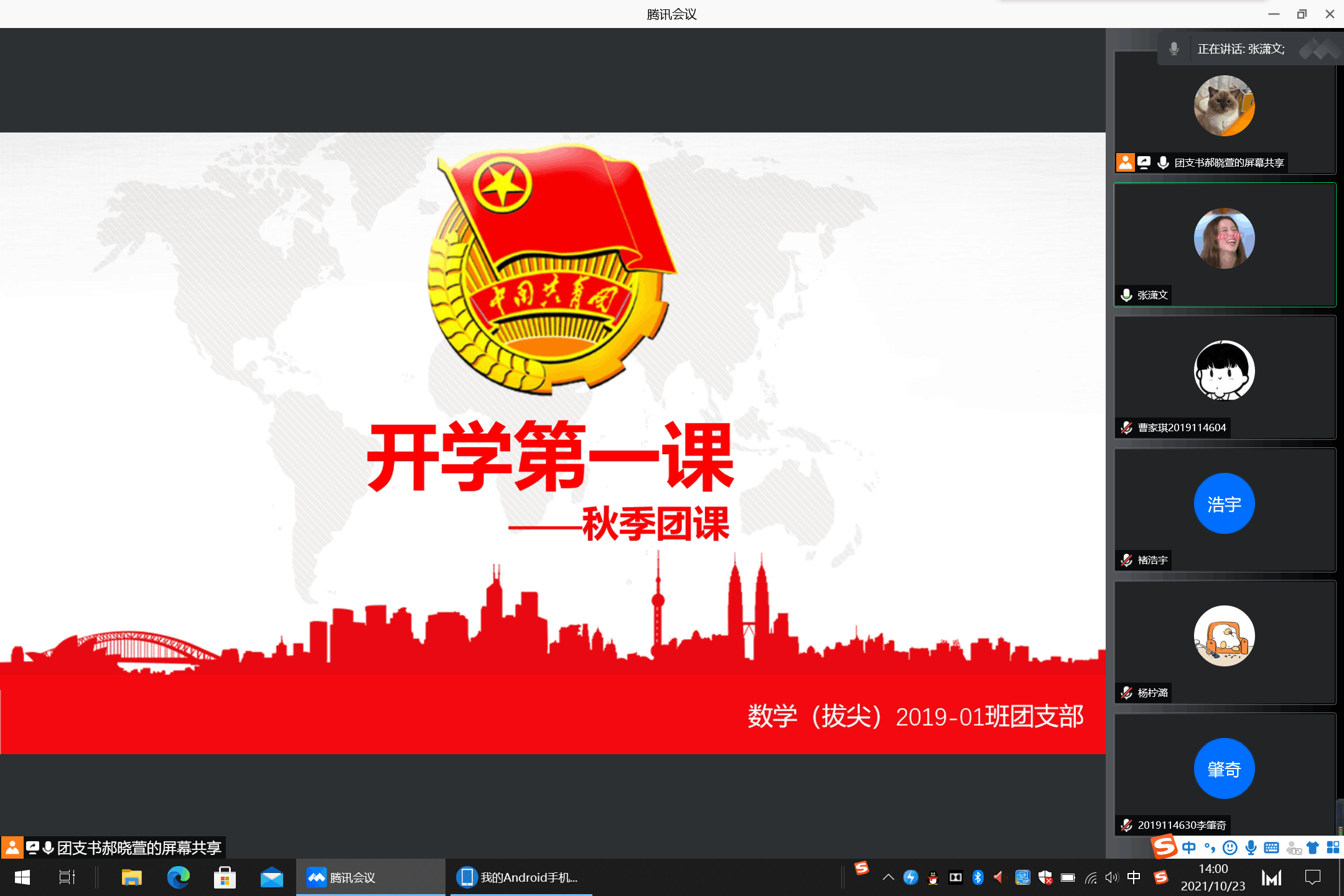 2021年10月23日下午2时,vwin德赢ac米兰官网数学(拔尖)2019-01班团支部秋季第一堂团课在线上顺利开展。本次团课应到团员10人,实到9人,其中一人因事缺席。由团支书郝晓萱主持召开。
