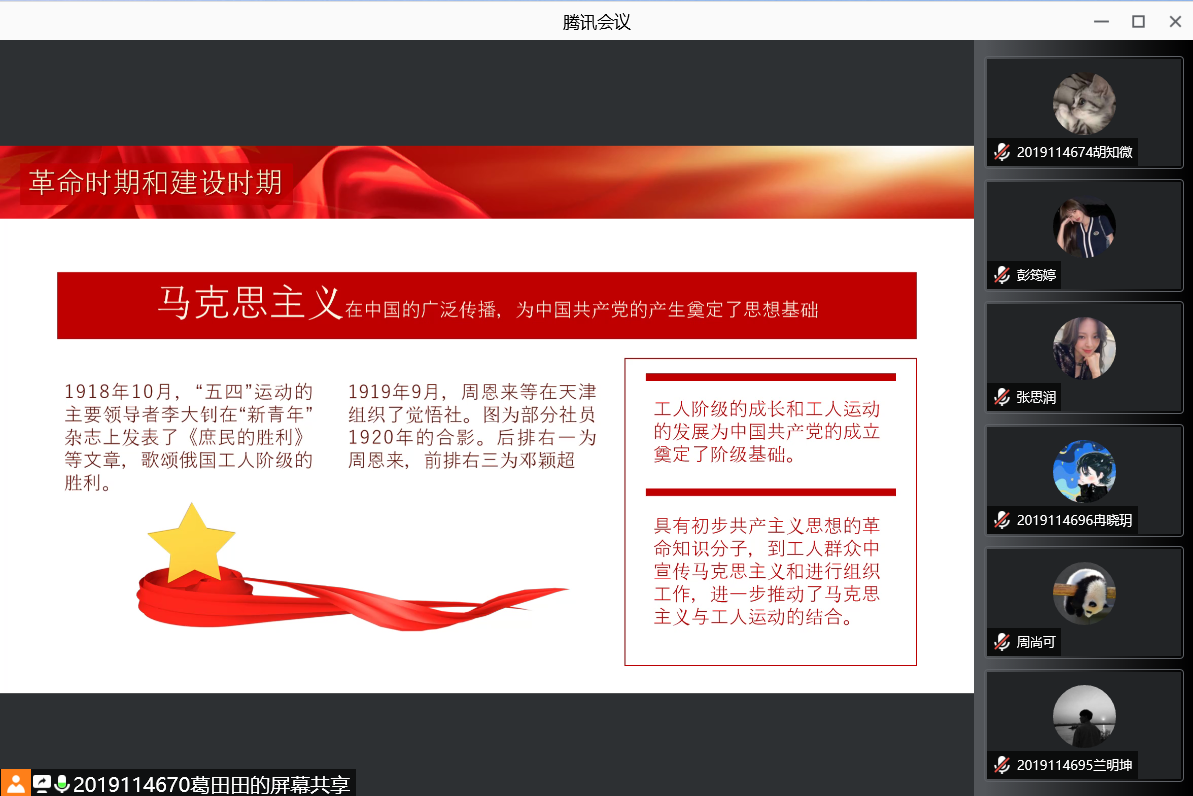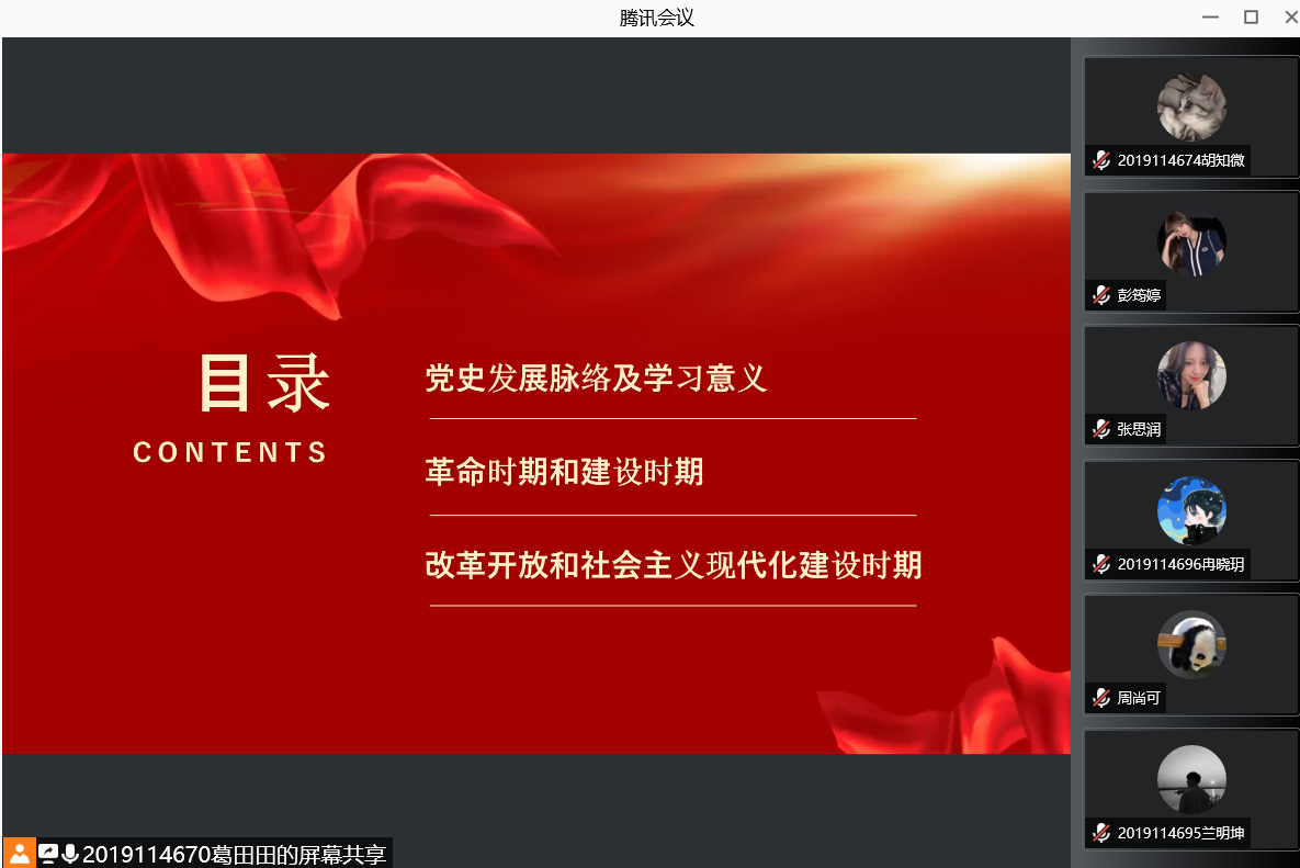 10月22日晚七点,19级统计一班召开了主题为“热烈庆祝中国共产党成立100周年”的秋季开学第一堂团课。会上,团支书与同学们共同回顾了中国共产党走过的百年历程,了解了当前我们党的历史任务,并结合青年人在国家社会发展中的重要作用,展望了未来的国家发展前景。