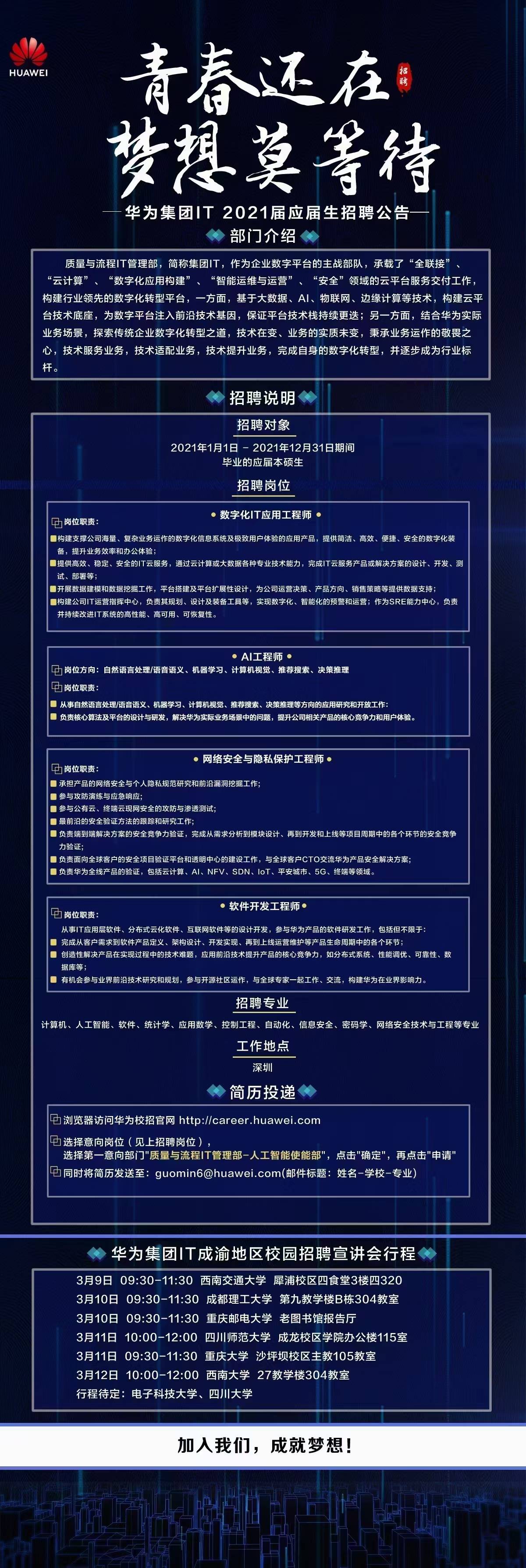华为集团IT应届毕业生vwin德赢ac米兰官网专场招聘会,时间:2021年3月9日晚上7:00,地点:四食堂三楼317会议室