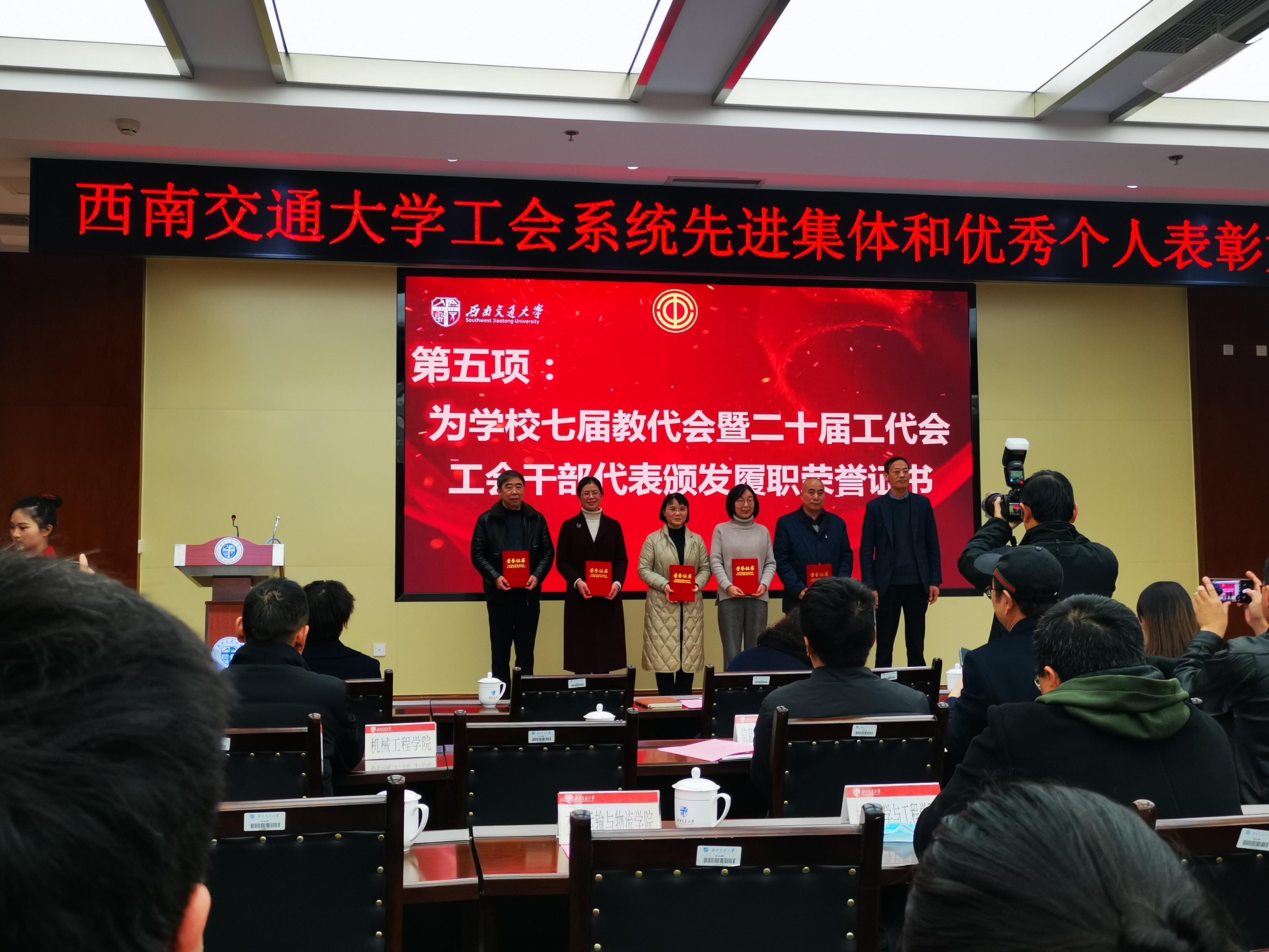 喻碧君副主席宣读工会系统表彰名单后,桂富强为省级、校级先进集体和优秀个人颁奖,同时为本届双代会各专门工作委员会工会干部代表颁发履职荣誉证书。郑江、喻碧君为工会系统优秀个人代表颁发荣誉证书。