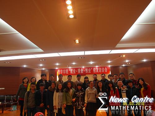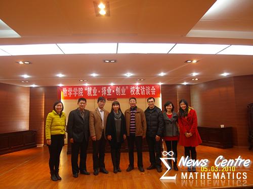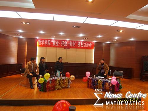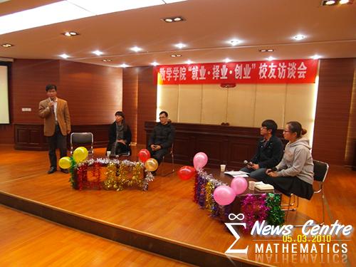12月5日下午14点整,vwin德赢ac米兰官网在X5403举办了以“就业·择业·创业”为主题的校友访谈会。学院热诚邀请了vwin德赢ac米兰官网交通运输与物流学院冯勋省副院长、信息科学与技术学院李天瑞教授以及企业家耿建婷女士,三位同是88级数学班的同学。同时vwin德赢ac米兰官网党委书记兼院长陈尚云教授,党委副书记李志辉老师,团委书记徐海晶老师,团委副书记张娟老师,及研究生辅导员郝虹老师参加了本次访谈会。 访谈会由2011级计算二班董士玮和2011级统计一班蒋宵主持。