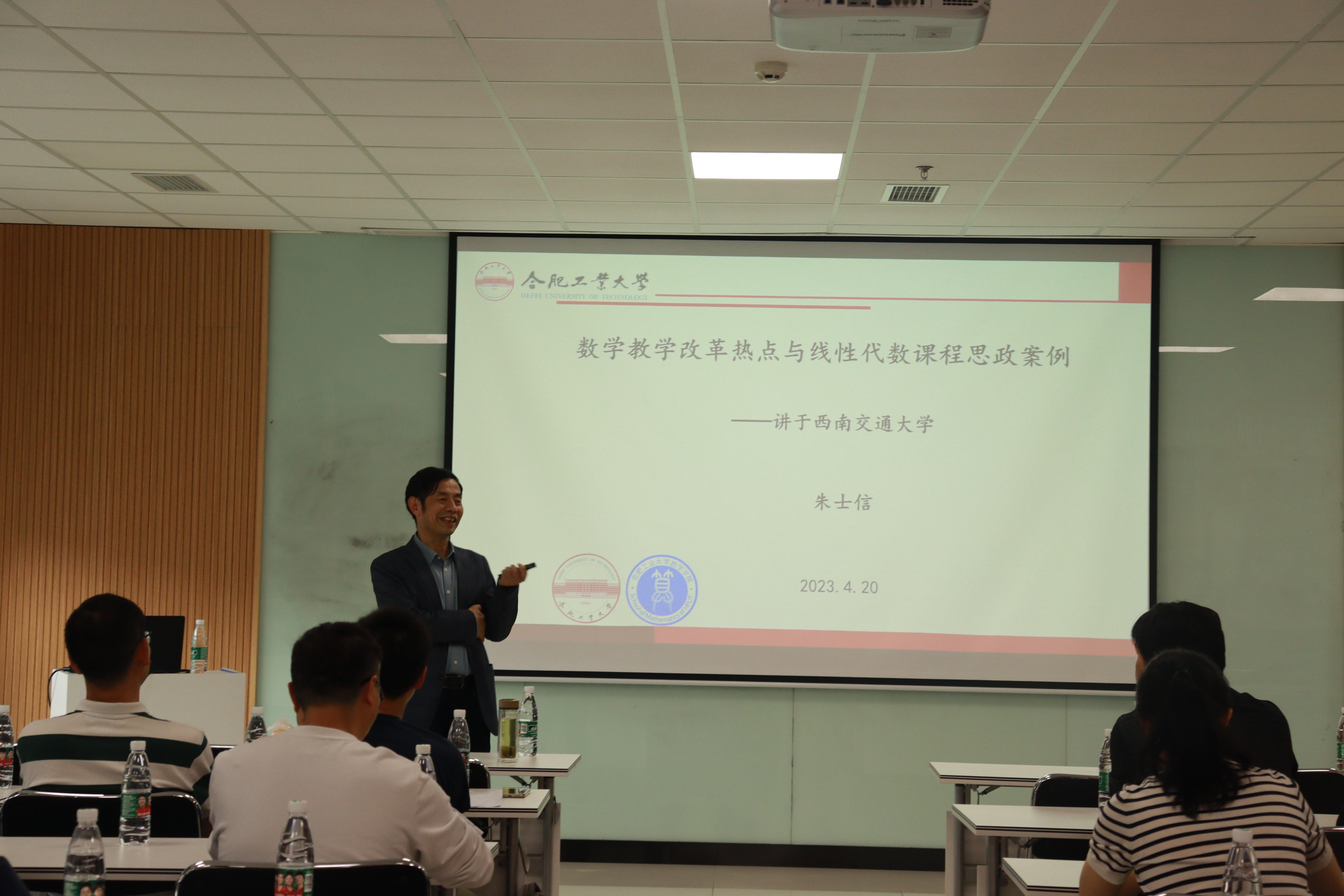 4月20日下午3时30分vwin德赢ac米兰官网邀请到来自合肥工业大学的朱士信教授进行了一场以“数学教学改革热点与线性代数课程思政案例”为题目的报告。朱士信教授在报告中介绍了近期数学教学改革热点,并分享如何在线性代数课程中开展课程思政,通过两个具体课程思政案例来示范课程思政案例设计的思想。他通过矩阵的线性运算在万里长城图像处理中的应用,介绍了长城精神。朱教授借逆矩阵的运算,介绍华罗庚矩阵形式等式,进一步引申到熊庆来的不拘一格降人才、华罗庚的爱国情怀,以及不拘一格降人才的文化传承。
