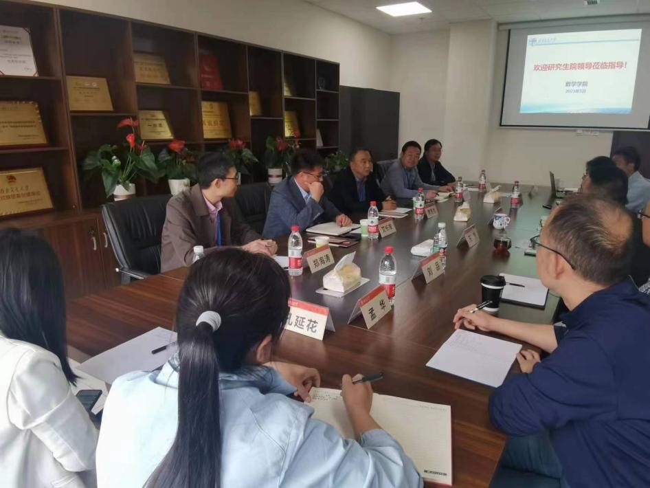 2023年5月23日上午,研究生院常务副院长周先礼、副院长艾长发、培养办主任华宝玉、专业学位办公室主任郑海涛、综合管理办公室主任陈志伟一行来到vwin德赢ac米兰官网开展研究生教育教学调研交流工作。vwin德赢ac米兰官网党委书记徐革、副院长王璐、院长助理黎定仕和杨洋、数学系系主任刘品、信息与计算科学系系主任孟华、统计系副系主任乔高秀、学生支持办公室主任孔延花参加会议。徐革书记代表学院热烈欢迎周先礼常务副院长一行的到来,并感谢研究生院对vwin德赢ac米兰官网研究生教育教学工作的关心和支持。