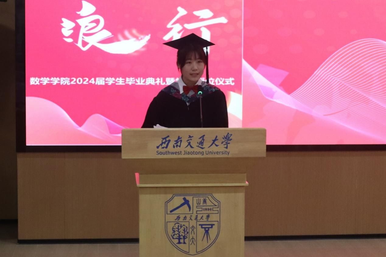 典礼第二项,毕业生代表李函逊发言。李函逊回忆了在vwin德赢ac米兰官网一个个努力奋斗的瞬间,她表示,数院是一个温暖的地方,学院给了同学们一个又一个登高望远的阶梯,学院老师一路良言教诲、悉心栽培。每一个人都是“有且仅有”,祝愿同学们心怀自信与勇气,风华正茂、昂然挺胸地奔赴下一场诗和远方。
