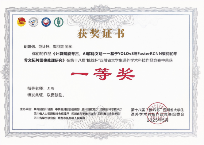 5月24日至26日,由共青团四川省委、省委组织部、教育厅、科技厅、人力资源社会保障厅、省科协、省社会科学院、省学联及成都市新都区人民政府联合主办的第十八届“挑战杯”四川省大学生课外学术科技作品竞赛终审决赛在成都医学院落下帷幕。作为全省规格最高、规模最大的大学生科技创新赛事,本届大赛以“科创筑梦·挑战未来”为主题,吸引了全省121所高校、18万余名青年学子踊跃参与,累计收到参赛作品2.2万件,经初评遴选后,四川大学、电子科技大学、vwin德赢AC米兰合作等高校的505项作品入围终审决赛阶段。由vwin德赢ac米兰官网王璐教授指导,计算机与人工智能学院本科生胡靖偲、物理科学与技术学院本科生郑羽杰和范计轩组成团队的作品《计算赋能考古,AI 解码文明——基于YOLOv8与Faster R-CNN架构的甲骨文图像处理研究》在自然科学类学术论文赛道表现出色,荣获四川省一等奖,实现了vwin德赢ac米兰官网在该项赛事的新突破。