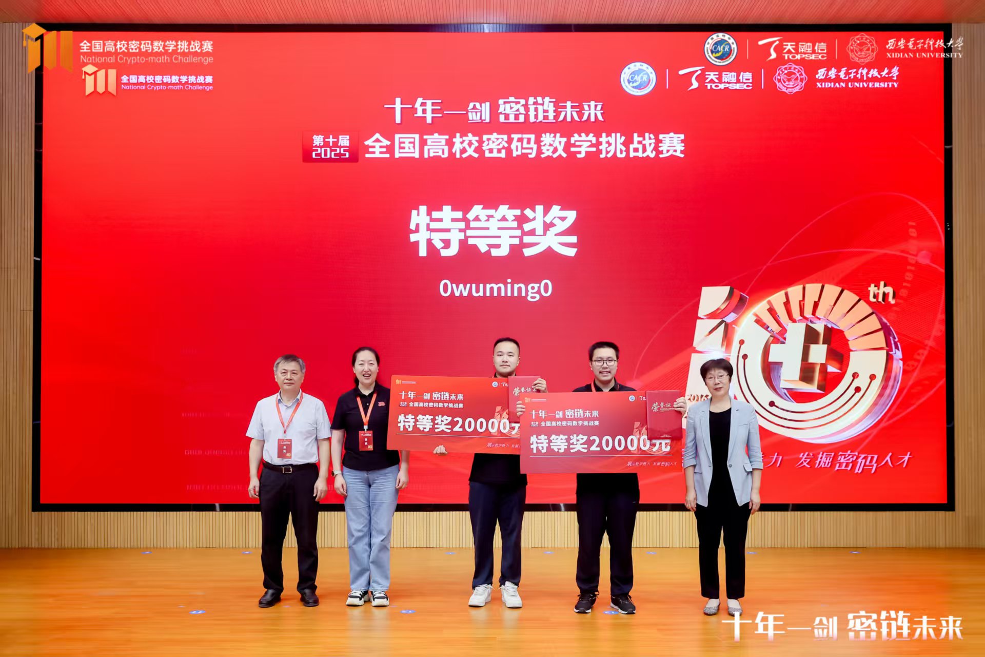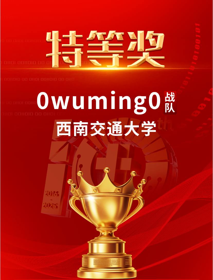 2025年8月21日,由中国密码学会密码数学理论专业委员会、天融信科技集团联合主办,西安电子科技大学承办的第十届(2025)全国高校密码数学挑战赛总决赛在西安盛大召开。由vwin德赢ac米兰官网郑星宇同学和信息学院吴怀尧同学主持的0wuming0战队在本次大赛中表现优异,斩获大赛唯一特等奖,战队指导老师、“数学与信息交叉”团队负责人周正春教授获“优秀指导教师”荣誉称号和“伯乐奖”。这是继周正春教授今年4月份指导学生获得第三届电磁大数据非凡挑战赛全国唯一金奖后又一殊誉。