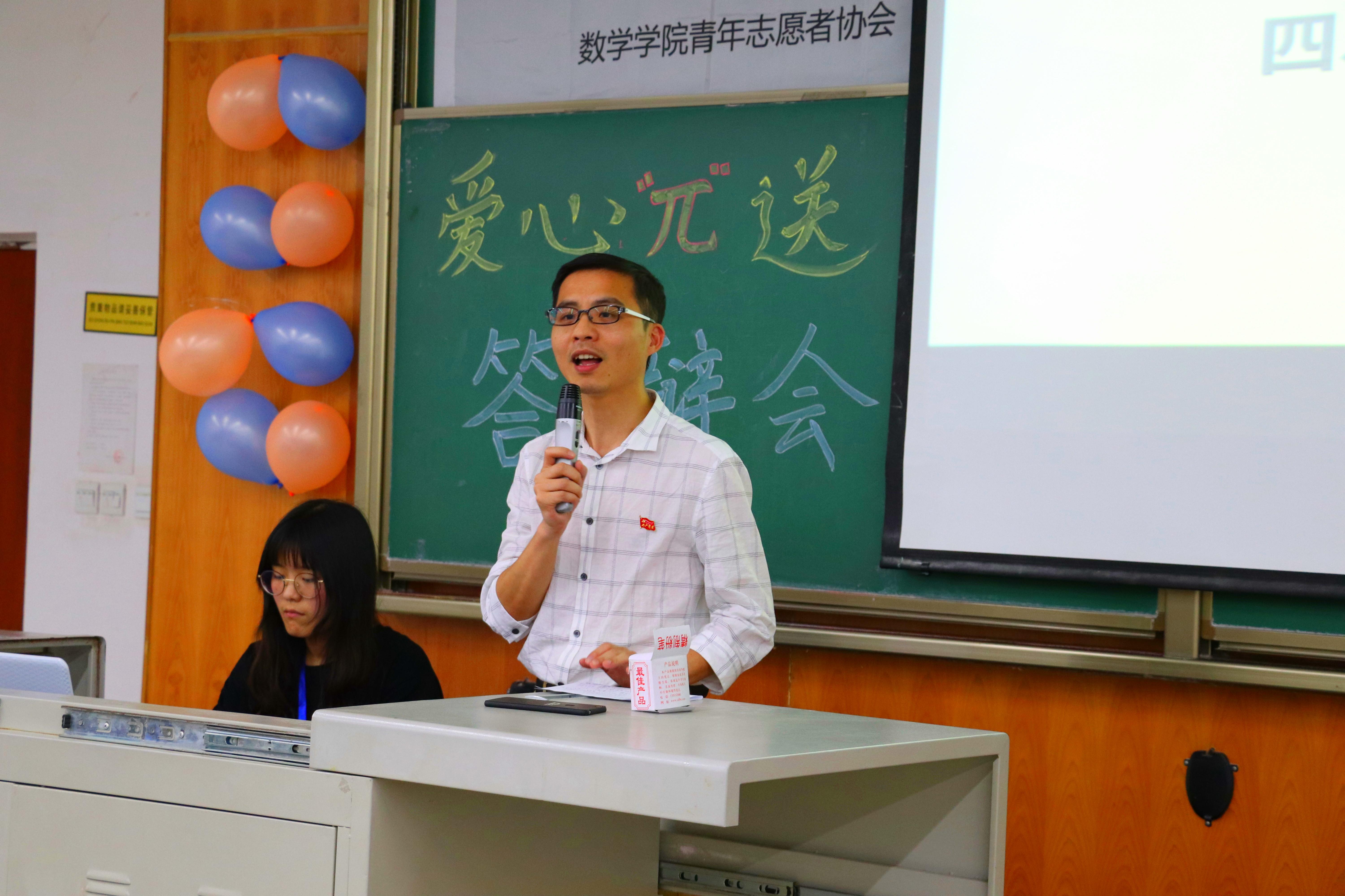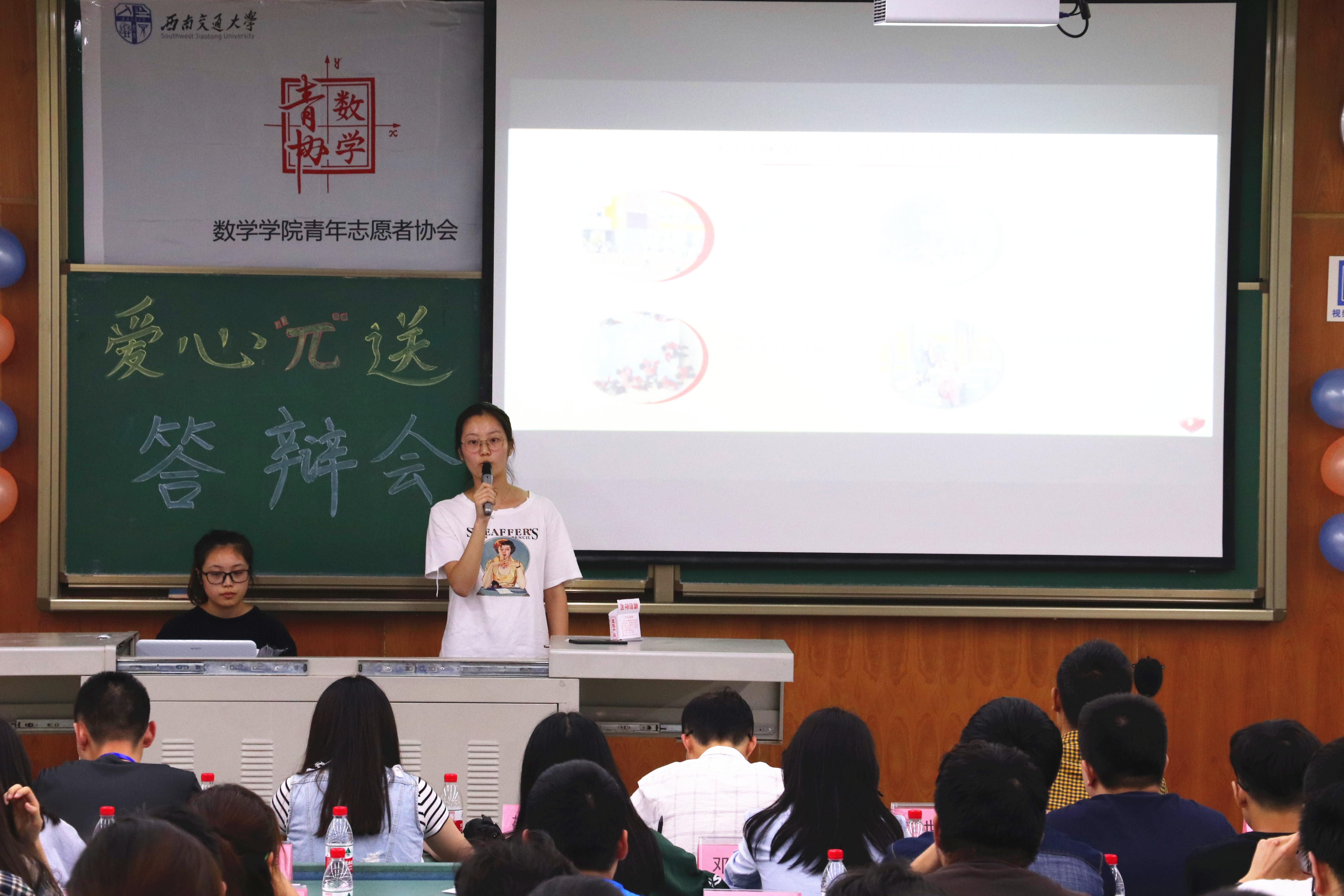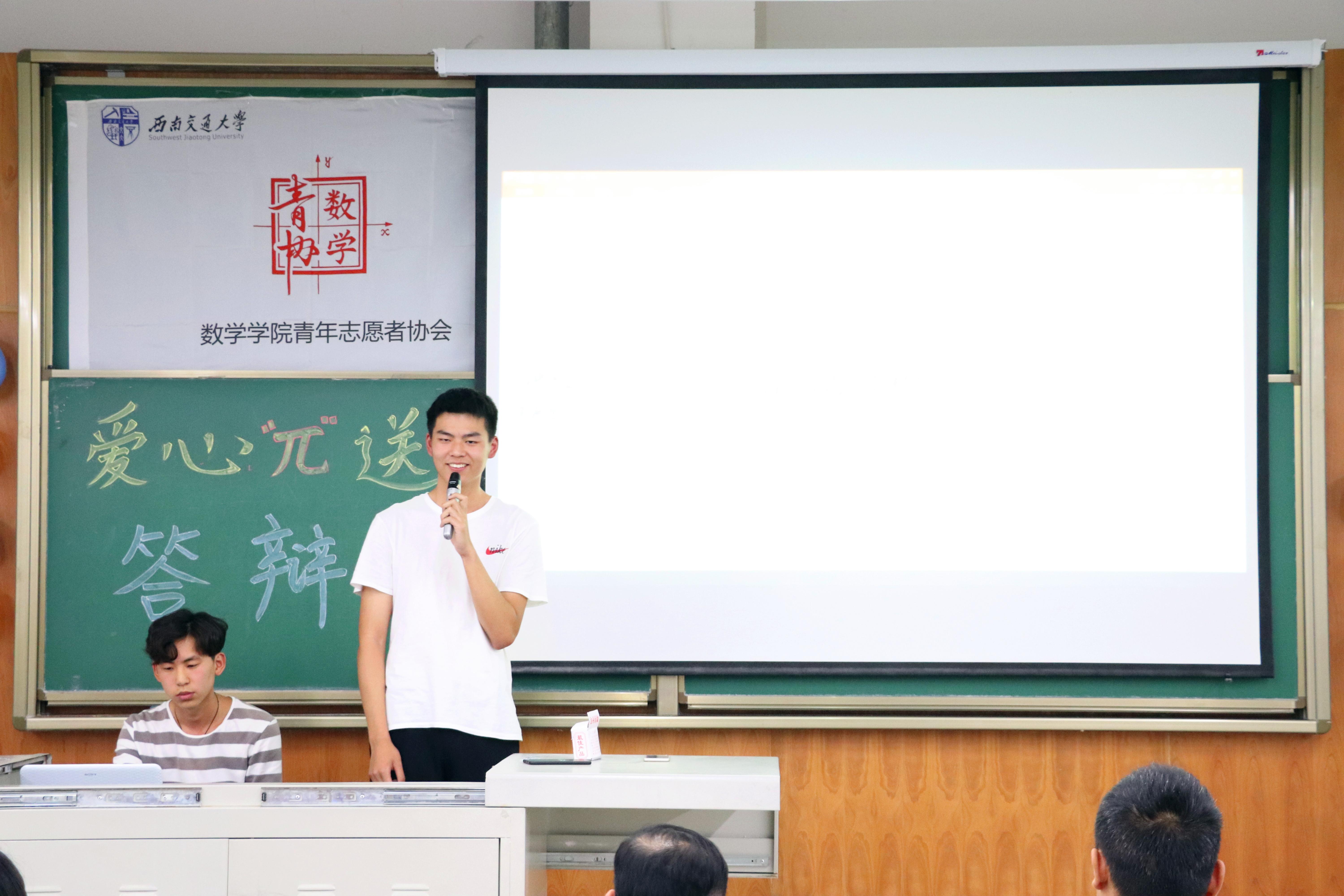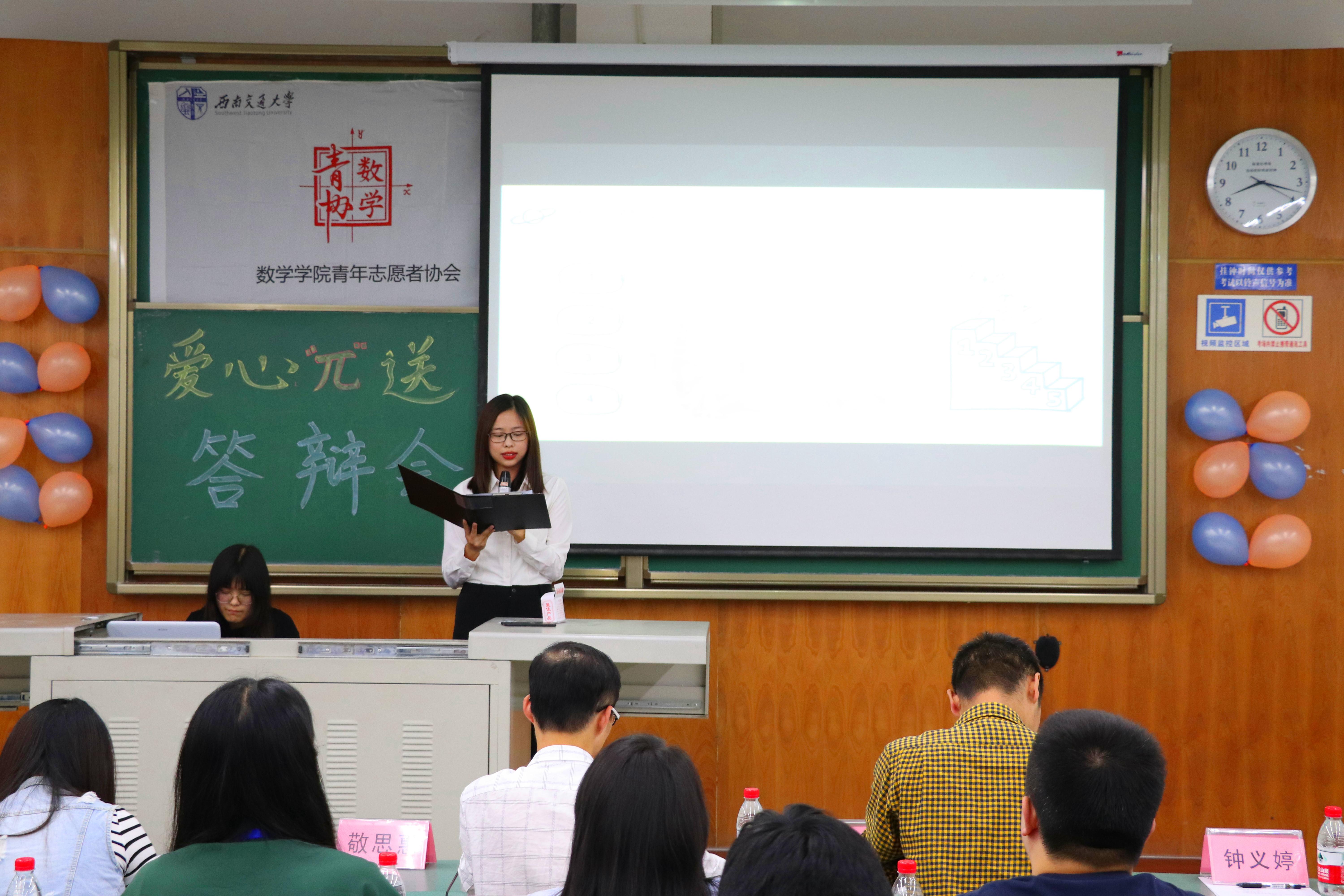 5月24日晚上7:30,vwin德赢ac米兰官网青年志愿者协会在X4153举办了主题为“爱心π送”的支队“1+1”答辩会。出席本次答辩会的有:vwin德赢ac米兰官网党委杨育鸿副书记,数院青协指导老师敬思惠老师,辅导员丰世隆老师,vwin德赢ac米兰官网社团联合会黄梓幸理事,青年志愿者协会秦天宇主席、王汇川副主席,数院学生会、新闻中心主席,以及土木、建筑等院青协主席。