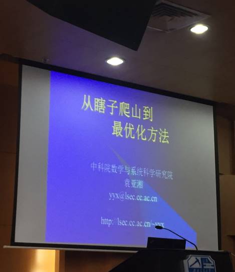 在报告中,袁院士将优化问题形象地比喻为爬山问题。爬山的目标是山顶,优化的目标是寻找最优解。为了更快地达到山顶,需要沿着“好”的方向走“合适”的距离,为了更快地寻找到最优解,需要也是需要沿着“好”的方向走“合适”的距离。袁院士用轻松、自然的语言向大家介绍了最速下降法、Barzilai & Borwein方法、共轭梯度法、信赖域法、拟牛顿法等优化方法,为到场的师生带来了一场学术盛宴。袁院士的报告深入浅出,幽默风趣,让大家在大笑之余能理解科学的真谛,同时和大家分享了数学的美和做学问的态度。