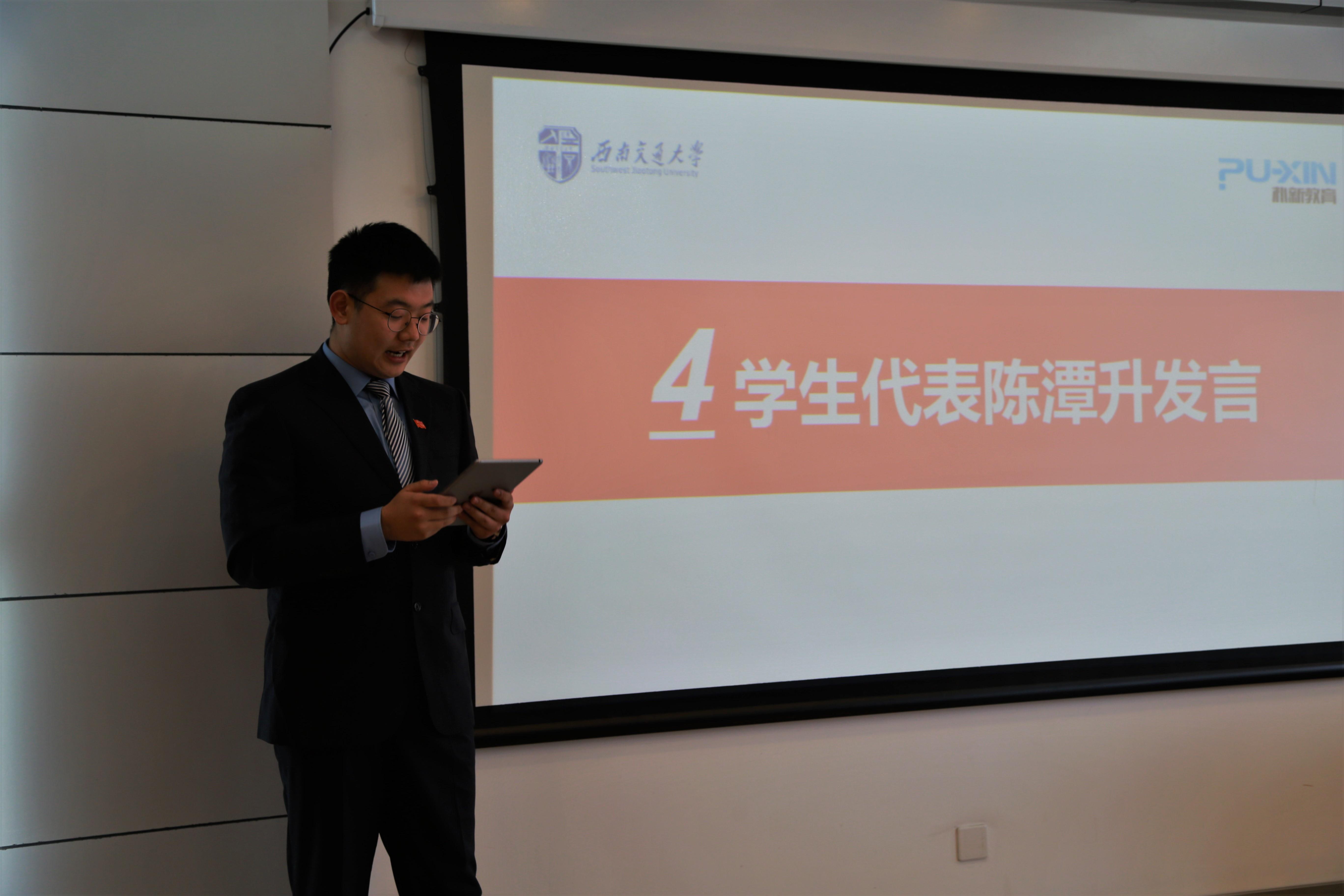 颁奖之后,获奖学生代表陈潭升发言,他代表同学们表达了对于朴新教育的感谢,朴新教育为同学们提供了更好机会去完善自身不足,激励自己前行,去探索更多可能的自己,陈潭升鼓励同学们共同进步再接再厉,学有所成回报社会。