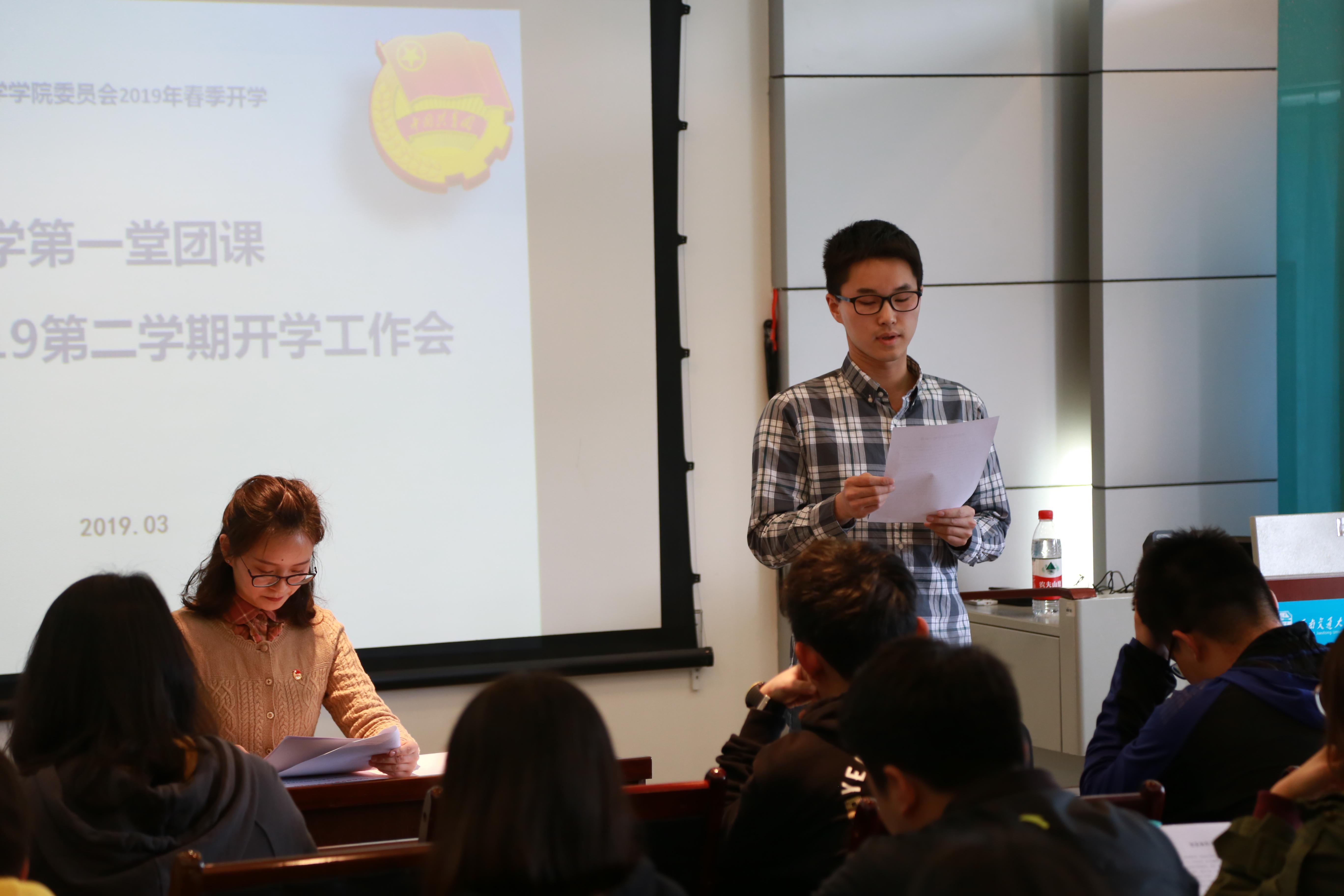 会议另一项是本学期团内的开学工作会。邓老师为大家讲解了校团委本学期的工作计划与活动实施方案。从3月到11月,每个月都有一个团日主题。邓老师针对这些主题为各团支部进行了大致的工作部署,鼓励团干部积极带领本支部团员参与团活动,争做优秀团员。
