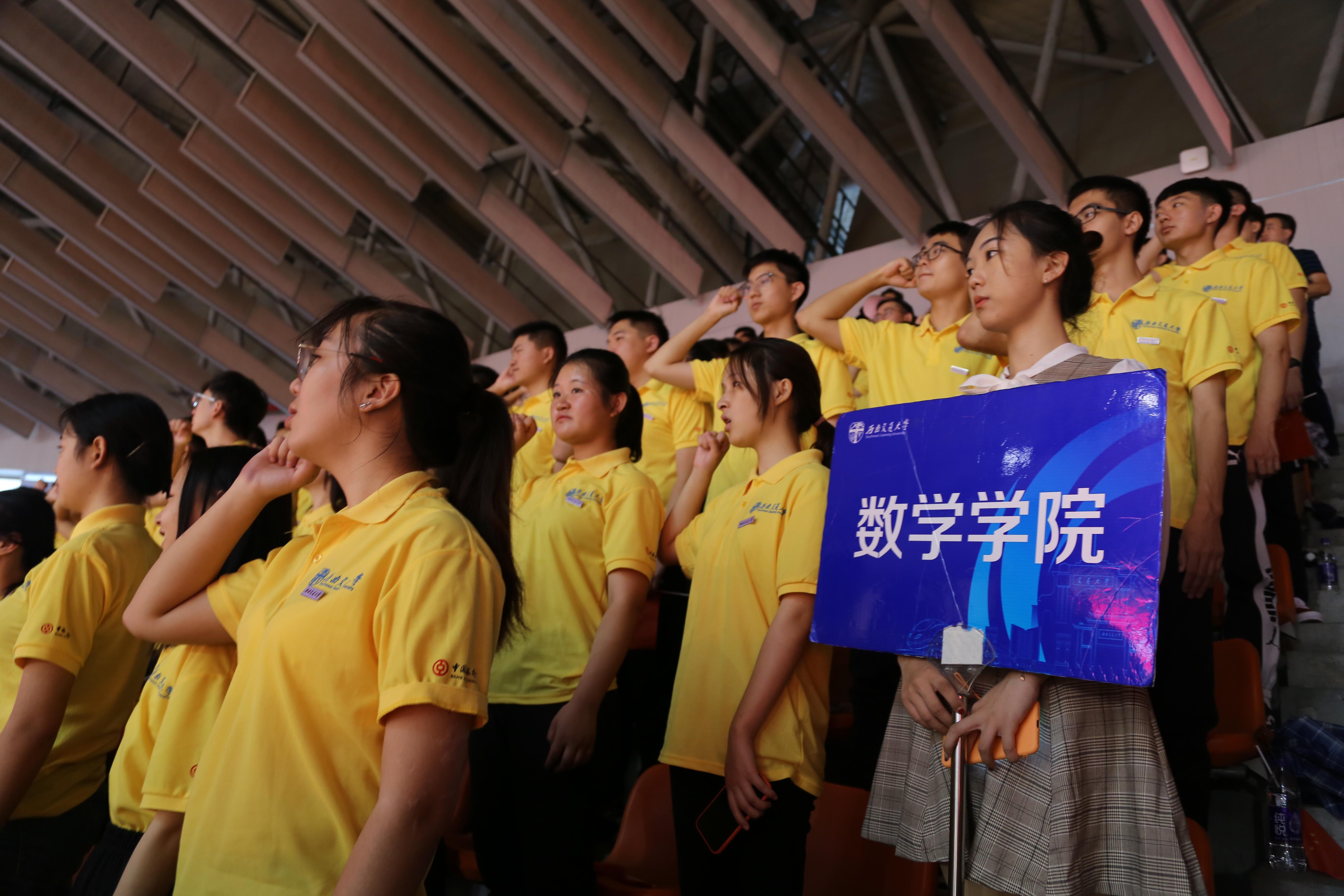 现场播放了两段精心制作的小视频,表现了学校对于新生工作的积极准备和对新同学到来的热烈欢迎。主持人一一介绍现场来宾,各个学院相继喊出口号。vwin德赢ac米兰官网学子精神饱满,意气风发,“百年交大,金牌数学”的口号响彻会场。2019级新生开学典礼正式开始,全体人员面向国旗奏唱国歌,严肃恢弘,气势磅礴。