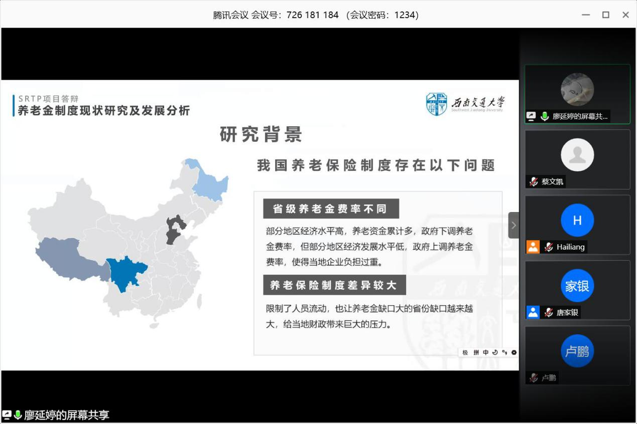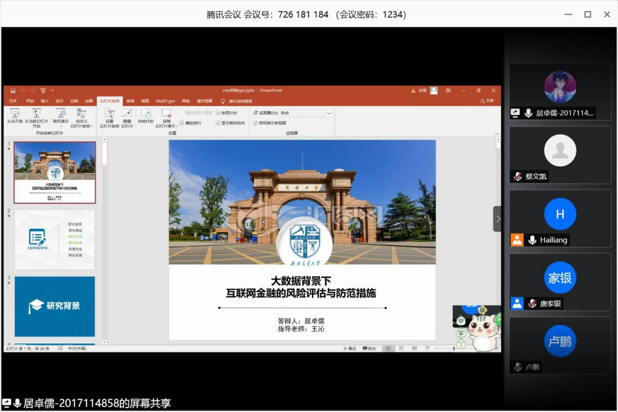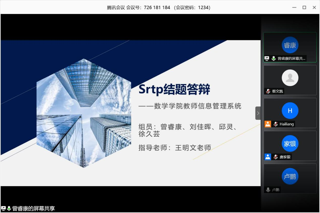 5月13日下午2点,vwin德赢ac米兰官网2019年度大学生科研训练项目(SRTP)结题验收答辩会于线上准时进行。此次答辩会的结题检查领导小组由王璐老师担任组长,潘小东老师担任副组长,赵海良、唐家银、刘品、梁涛老师等作为组员。全体参会人员准时进入会议参加答辩。