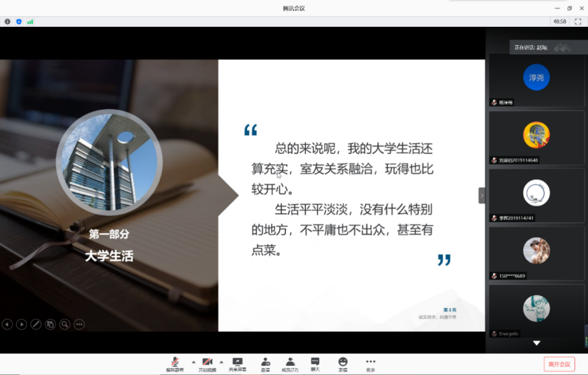 第三位分享人为2016级统计专业的江自豪同学。他从保研介绍,营前准备,参营经验,经验总结方面进行分享,介绍了保研的具体方法,让同学们更加全面地了解到保研的相关准备。