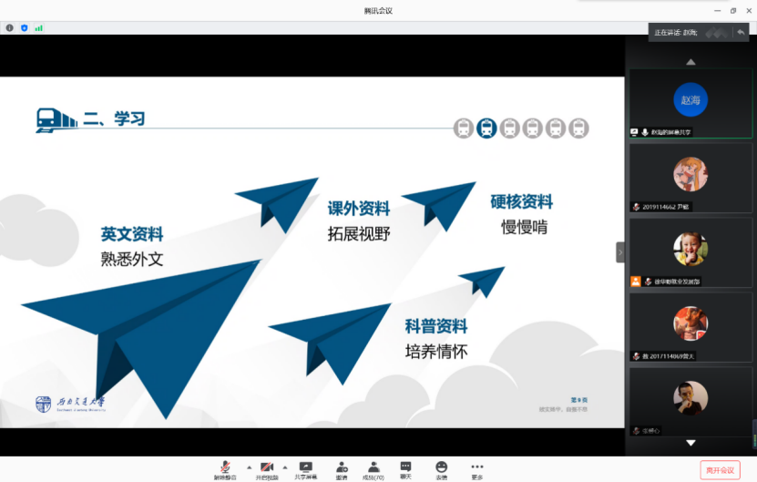 接下来,2016级赵海同学从自己的大学生活开始讲述,分享了自己在学习、生活、竞赛、免研准备等多个方面的经验,着重介绍了在学习方面的经验与方法。