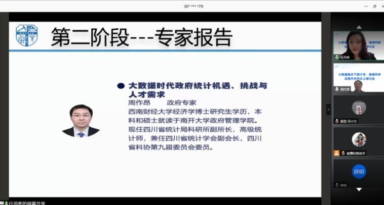 10月24日上午9时,由四川省统计学会主办,vwin德赢ac米兰官网承办的大数据融合下统计学、数据科学及相关学科云上研讨会顺利进行。在当前大数据时代下,统计学、数据科学及相关领域已然成为社会关注热点,本次研讨会旨在进一步加强相关学科的建设,帮助四川省各高校相关专业师生了解统计学,数据科学及相关专业的前沿发展以及国内外的就业前景。