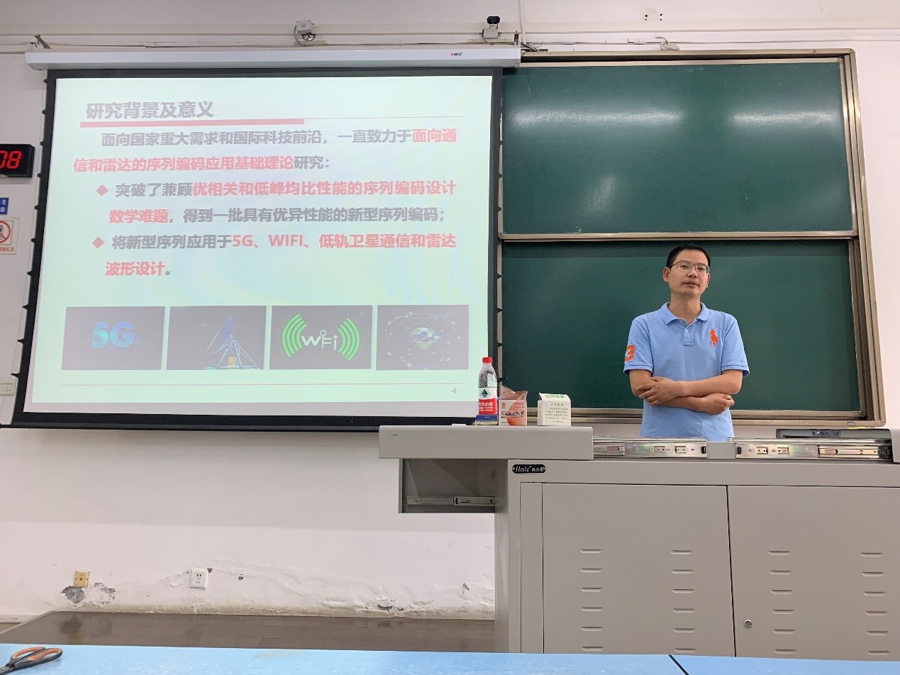在主持人的介绍下,杨洋教授开始了专业知识的分享交流,首先介绍了其研究方向:序列编码。这是一门属于数学与信息学科的交叉领域,涉及通信、雷达和密码的数学基础理论问题。杨洋老师从研究背景及意义入手,讲解了该领域在国家重大需求和国际科技前沿所发挥的作用,是一门实用性强,可研究性高的科学学科领域。接着杨洋教授从学术具体内容如非周期相关函数、峰均比、频谱受限的OFDM序列等做了专业知识报告,报告过程中同学们认真做笔记,不断接受着新的认知与概念。最后,杨洋教授介绍了他所在的团队“数学与信息交叉团队”及其研究实验成果。该团队近年来主持了国家自然科学基金国际合作项目、JW科技委国防科技创新特区项目、四川省杰青项目、华为/10所/30所等企业的研究所委托横向项目等重量级项目,取得了非常丰厚的科研成果,其中一项序列成功被11be标准采纳,且拥有两篇潜在高价值专利,实验成果整体评价优秀。