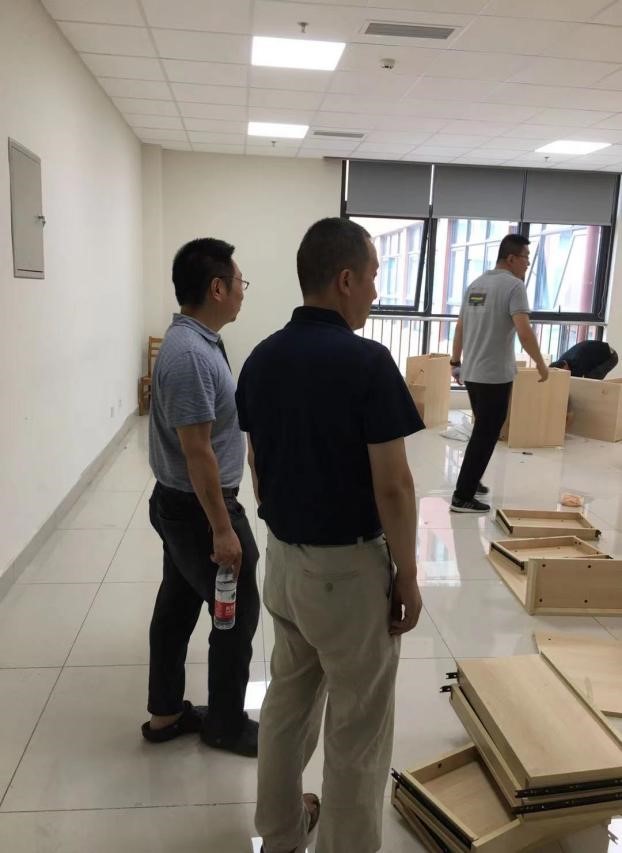 恰逢今天下午学院在制作各房间的功能名称铭牌以及峨眉校区实验室搬迁至犀浦校区,看到工人们忙碌有序的身影,杨院长一行不忘来到专业实验室X30458仔细查看电脑桌椅的安装与摆放,校企合作的“极客科创工作间”X30456也在紧锣密鼓的装修中,强调大家要注意装修期间的用电安全等环节。由于峨眉校区实验室电脑以及配套桌椅此次是分开搬运,电脑桌椅先搬到了犀浦校区专业实验室,搬运终端电脑的车辆还在前往犀浦的路上,杨院长不忘强调要落实人员对接,确保安全。最后,杨院长强调大家要做好此次走访与实验室安全隐患排查的记录与整改,安全责任要落实到位。