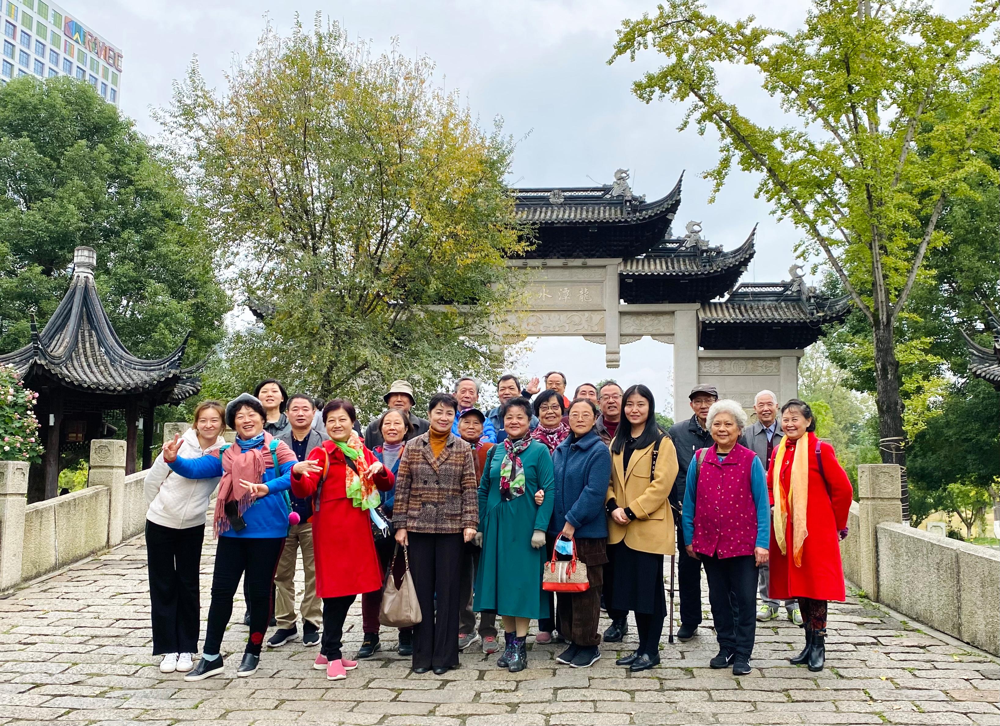 10月27日上午9:00,参加活动的退休老师们分别在九里、犀浦校区集合,经过近一小时车程,到达龙潭水乡。大家兴趣盎然,在景区漫步,欣赏建筑物和美景,有的三五相约频频合影留念,笑谈美好生活。