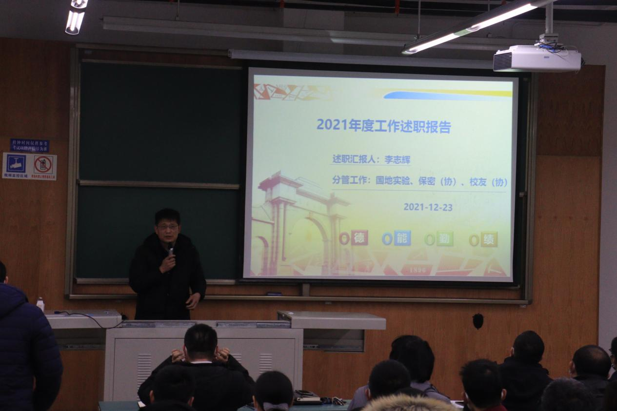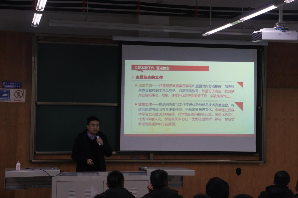 黄祥副书记以“立足本职工作,坚定信念”为主题,对负责的纪委工作、宣传工作与学生工作进行了详细总结。