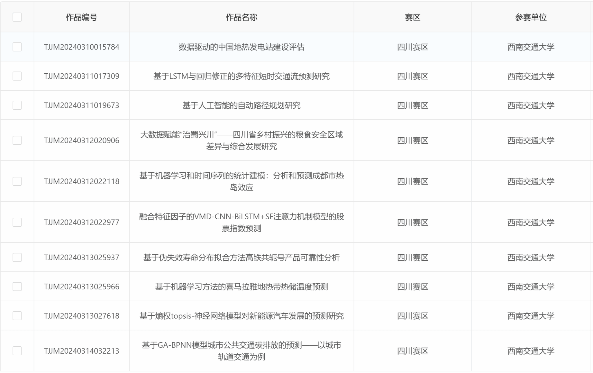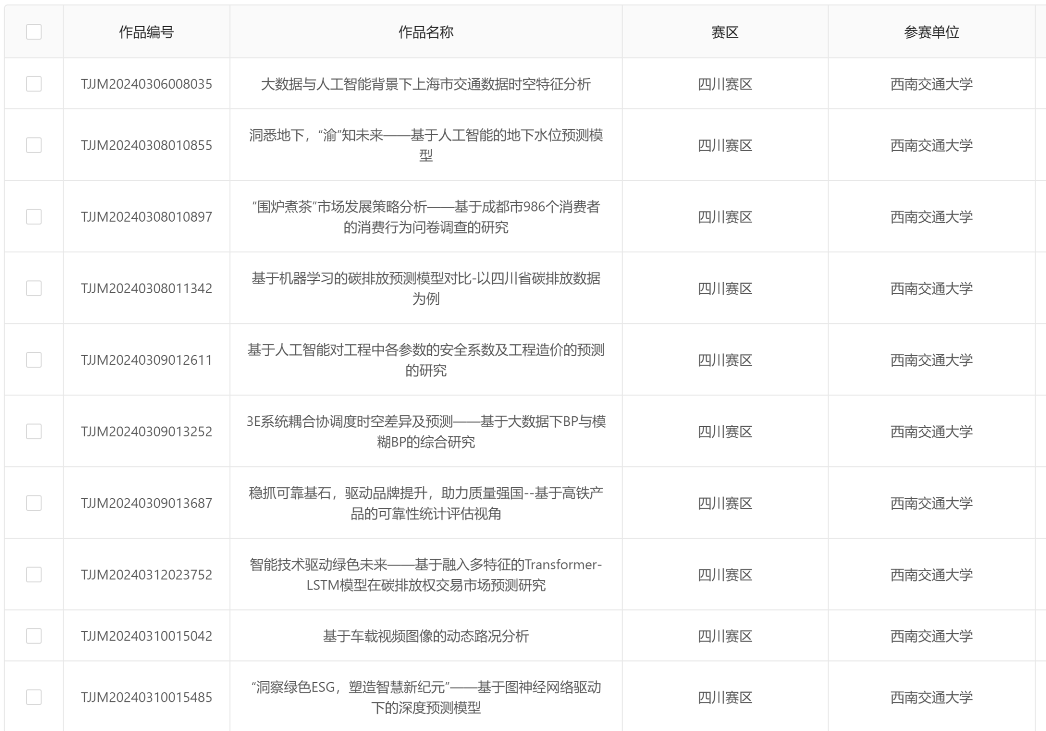 2024年第十届全国大学生统计建模大赛,vwin德赢AC米兰合作第1届统计建模校校内选拔赛已于2024年5月22日上午在犀浦校区9号教学楼9136,2024年5月22日下午在犀浦校区3号教学楼30348,2024年5月30日下午在犀浦校区3号教学楼30425顺利举行。现将校级晋级省赛名单公示,四川赛区统计建模组委会将随机选取匿名作品进行复核与评议,最终晋级省赛名单以四川赛区公示为准。
